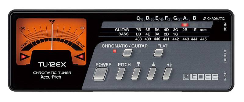 Хроматический тюнер. Предназначен для гитары и баса. В комплекте: 2 батареи питания (углеродные типа AAA), руководство, чехольчик, дополнительные листки с информацией. Цвет чёрный