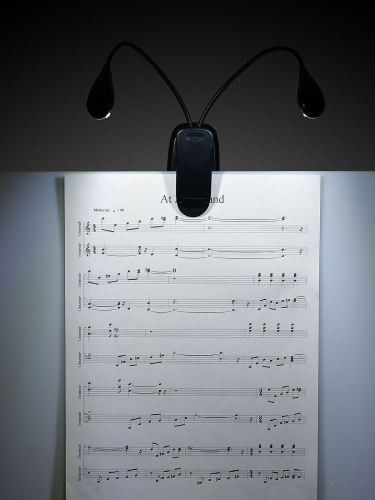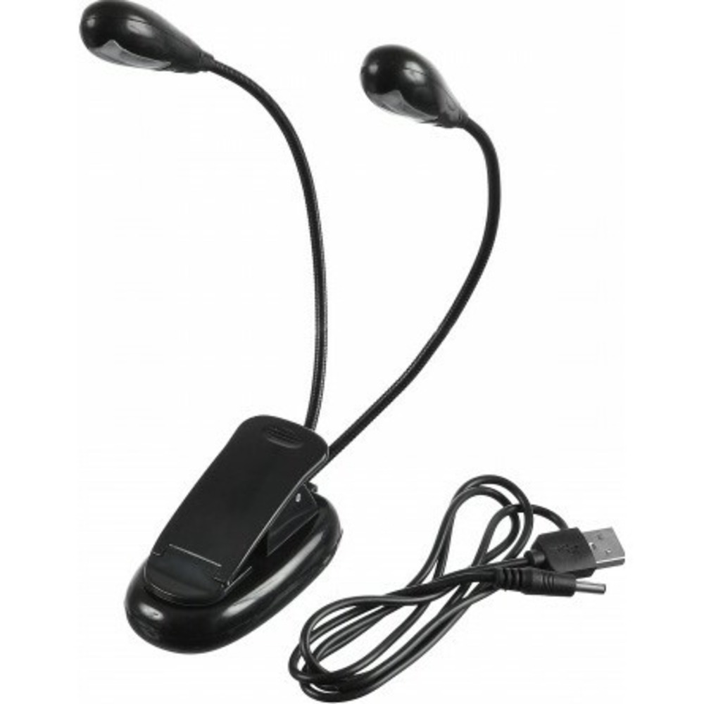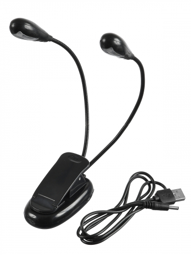 Подсветка для пюпитра DEKKO FL-9027 BK «прищепка», два Led фонаря, гибкие основания (20см), раздельное включение, направленный свет, ступенчатая регулировка, пит. 5V AAAх3, USB, цвет - чёрный, (провод в комплекте)