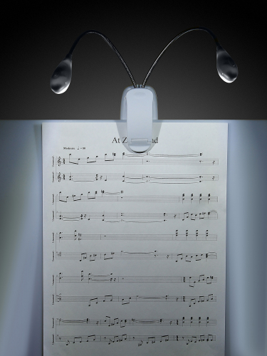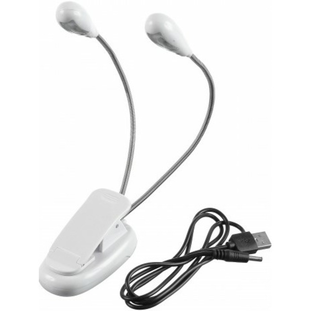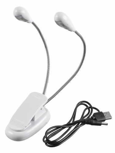 Подсветка для пюпитра DEKKO FL-9027 WH «прищепка», два Led фонаря, гибкие основания (20см), раздельное включение, направленный свет, ступенчатая регулировка, пит. 5V AAAх3, USB, цвет - белый, (провод в комплекте)
