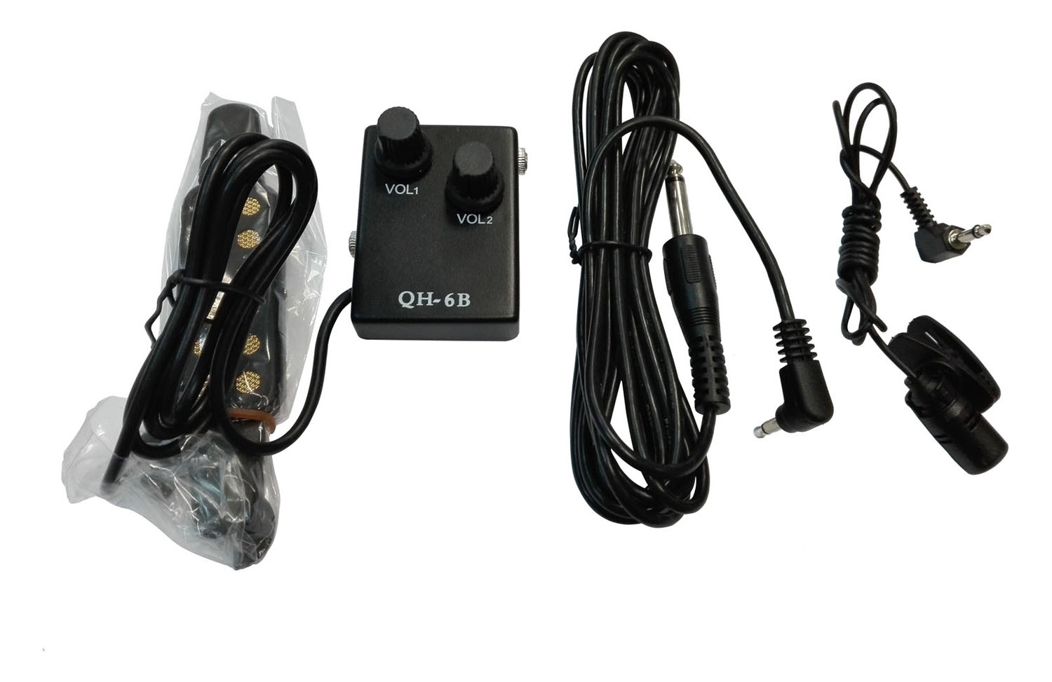 Звукосниматель для акустических гитар BRAHNER QH-6B встраиваемый в резонаторное отверстие, электромагнитный. С подключением петличного микрофона (в комплекте), раздельные регулировки громкости. Длина кабеля 3м, джек 6.3мм