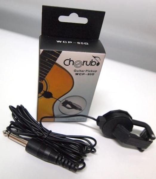 Пьезодатчик (звукосниматель) на прищепке гитарный, длина шнура 1 метр, разъем 6,35 мм.