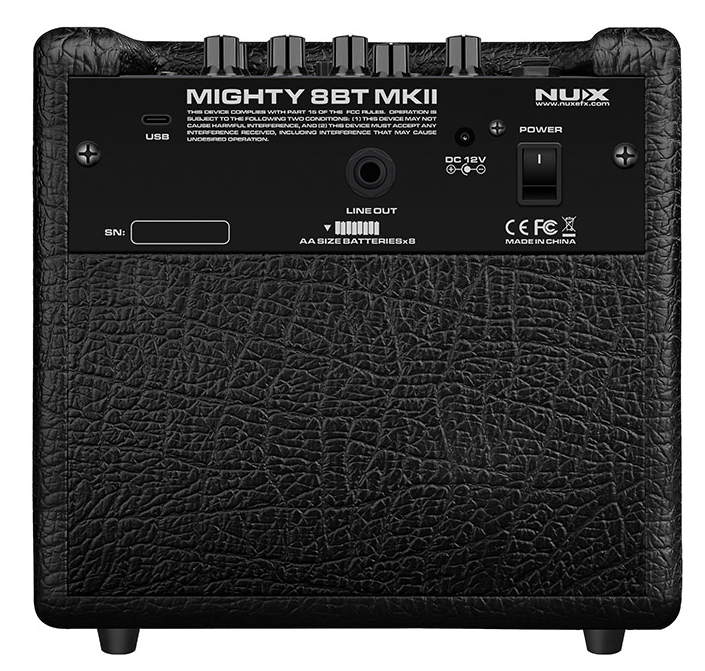 Цифровой комбоусилитель Nux Mighty-8BT-MKII (Пр-во КНР) портативный, 8Вт, Динамик 6,5 дюймов FRFR с IR-технологией. 8 батареек типа АА. Эффекты для электрогитары и бас-гитары. Моделирование акустических усилителей и акустические IR, позволяющие имитировать звуки акустической гитары. Канал для подключения динамического микрофона. Приложение Mighty Amp для смарт-устройства (iOS/Android) или программного обеспечения Mighty Editor (для Mac/ПК). MIGHTY 8BT MKII поддерживает аудиопоток USB-C. Поддерживает маршрутизацию Normal / Dry Out / Re-amp / Loopback. Функция Patch Level для каждого пресета. Драм-машина. Сопротивление входа Instrument: 1 МОм. Сопротивление входа MIC: 6,2 кОм. Сопротивление входа AUX In: 9,1 кОм. Выход на наушники: 280 мВт+280 мВт (до нагрузки 33 Ом). Частота дискретизации: 48 кГц/32 бит. Задержка системы: 1,42 мс. Потребляемый ток: 12 В постоянного тока, 170 мА. Динамик: 6,5 дюйма, 4 Ом, 8 Вт. Размеры: 240 х 166 х 220 мм. Вес: 2,96 кг.