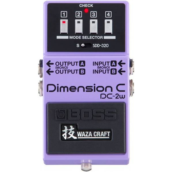 Boss DC-2W – педаль эффекта хорус, переиздание легендарного редкого хоруса Boss DC-2 Dimension C, выпущенного в Японии в 1985 году. Модель также включает в себя тембры не менее значимого стереохоруса Roland SDD-320 Dimension D. Доступно 4 фиксированные настройки аналогового хоруса без возможности редактирования. Переключение между ними происходит с помощью клавиш, а за включение и выключение эффекта отвечает фирменная «мягкая» кнопка Boss без щелчка. Как и во всех педалях серии Waza Craft здесь присутствуют два режима звучания – это Standard и SDD-320. Основным отличием версии Waza Craft от оригиналов является возможность включать настройки попарно. Таким образом, вместо 4 тембров Dimension C вы получаете 20 различных типов модуляции с разной степенью глубины и интенсивности. Также имеется парный вход, в который можно подключать другие стереоэффекты или инструменты и обрабатывать их хорусом. Новая модель лишена проблем с клиппированием на входе, использовать педаль можно с любыми, звукоснимателями.