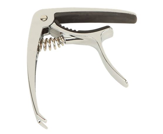 каподастр для акустической гитары. Материал: металл с резиновыми накладками. Тип конструкции: пружинный. Особенности: выемка для снятия фиксатора струн. Цвет: серебристый. Упаковка: блистер. Производитель: Китай.