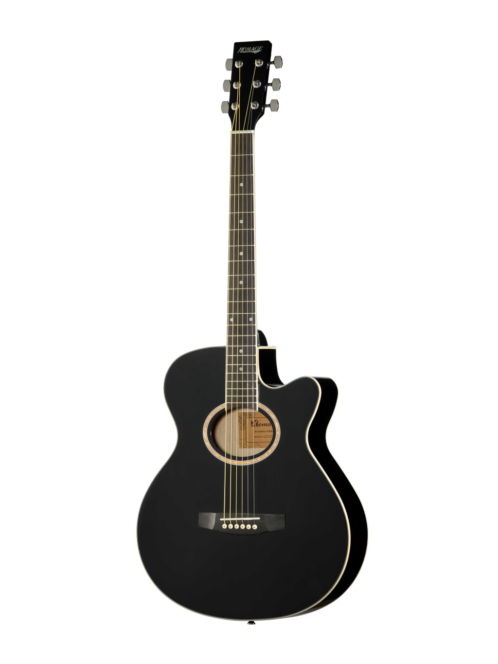 LF-401C-B Фольковая 6-струнная гитара 40" с вырезом. Верхняя дека - ламинат ели, задняя дека и обечайки - ламинат, гриф - клен, накладка грифа - палисандр, бридж - палисандр, колковая механика - хромированная, окантовка - 5-слойный кант, цвет- черный. HOMAGE