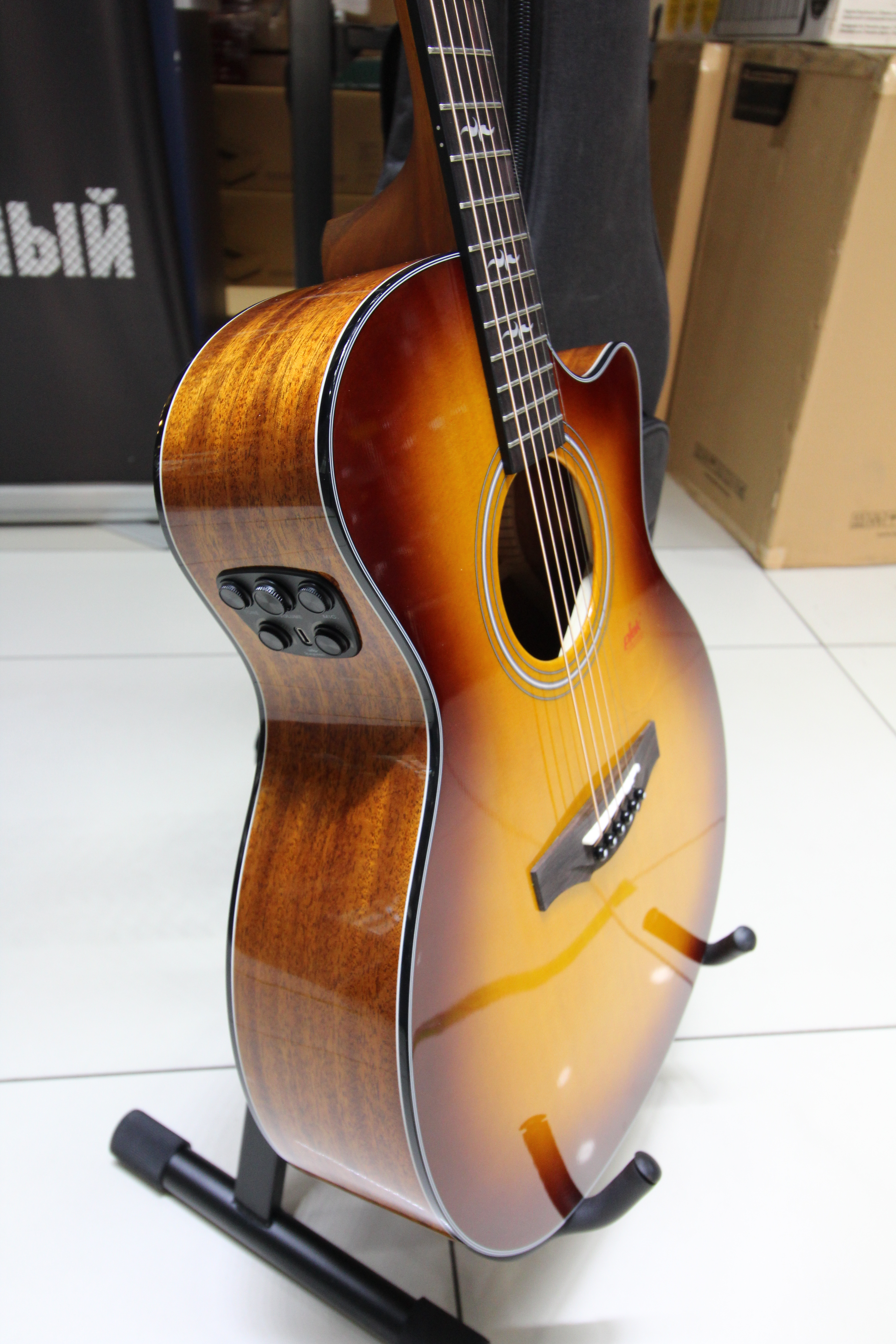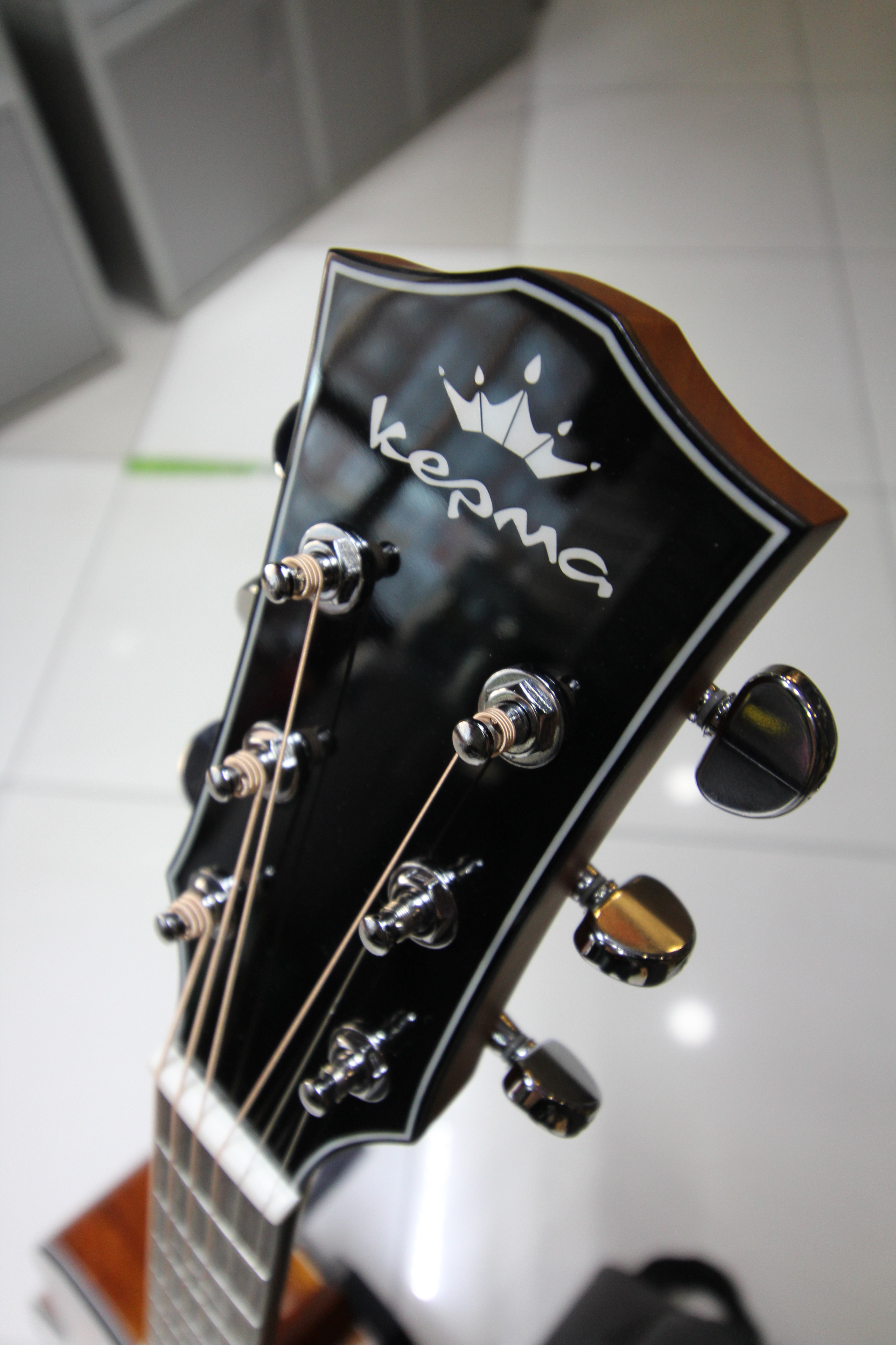 Трансакустическая гитара Kepma F1E GA начинает линейку топовых инструментов. На ней стоит трансакустический блок — специальное устройство, которое позволяет играть с эффектами хоруса ревера и дилея без подключения к усилителю. Звук идет прямо из корпуса.