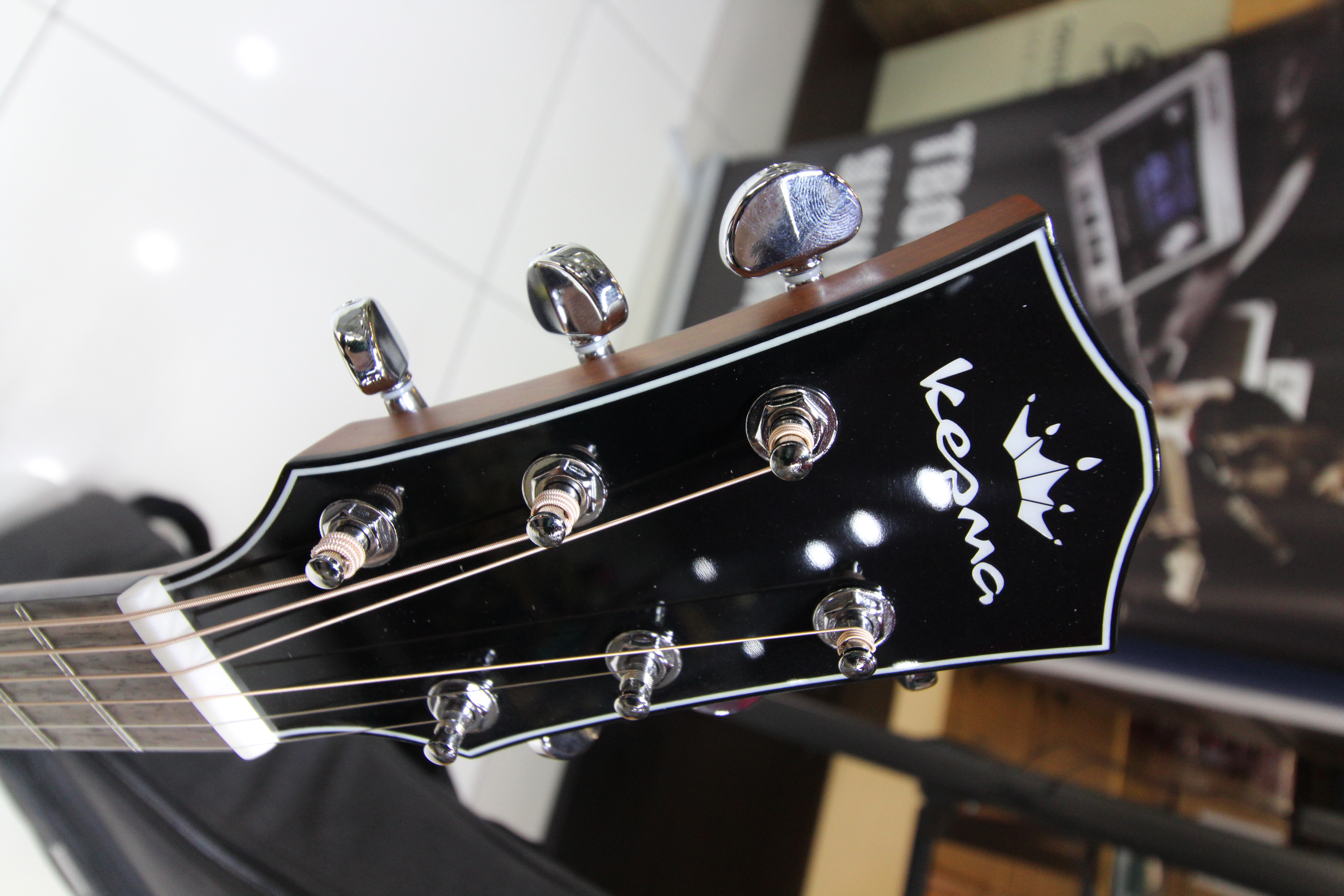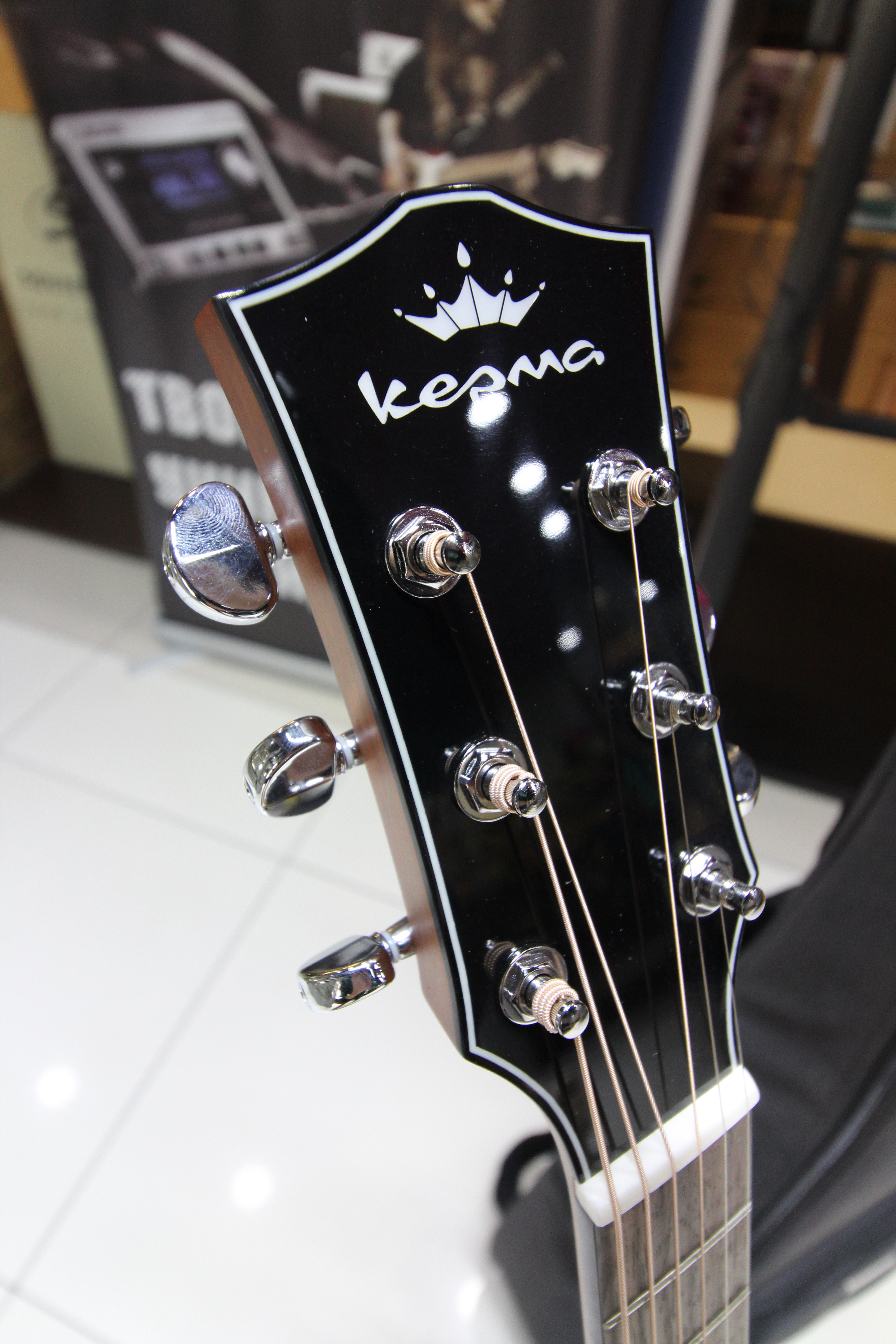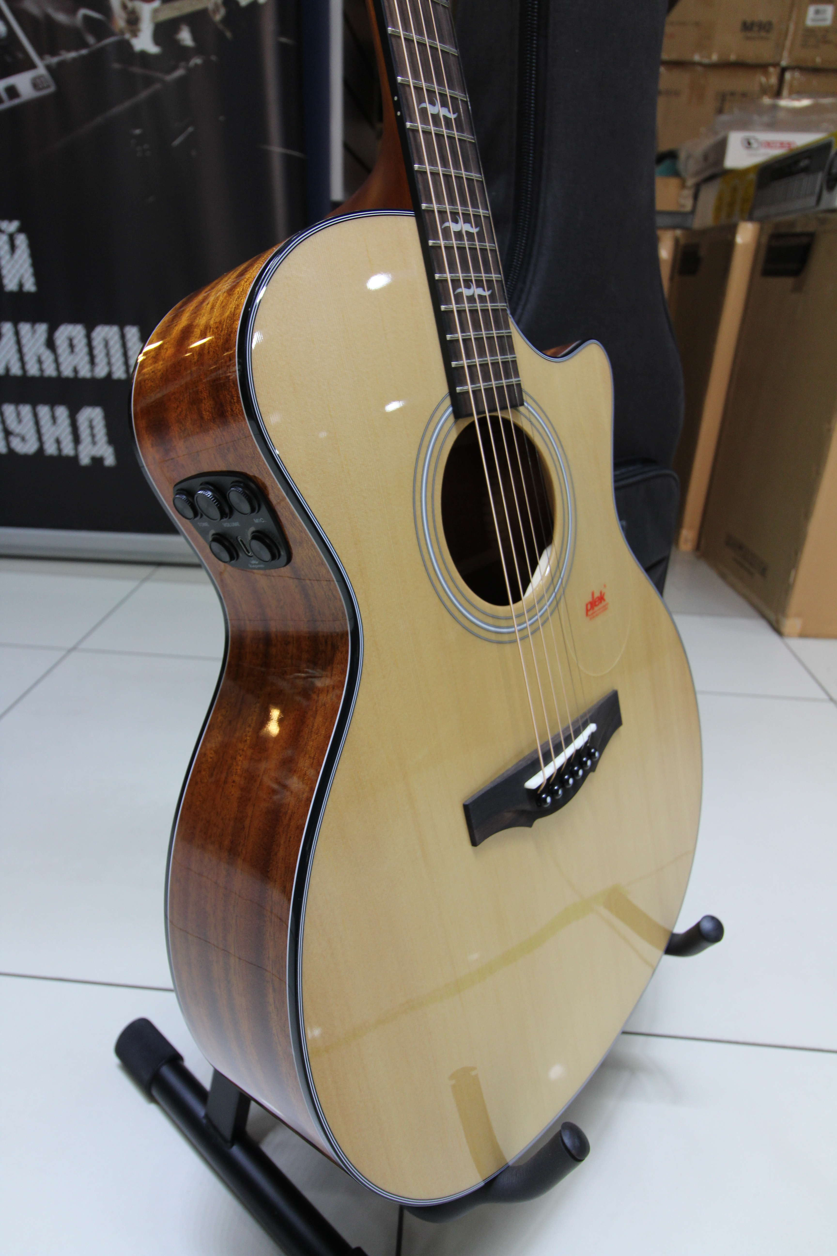 Трансакустическая гитара Kepma F1E GA начинает линейку топовых инструментов. На ней стоит трансакустический блок — специальное устройство, которое позволяет играть с эффектами хоруса ревера и дилея без подключения к усилителю. Звук идет прямо из корпуса.