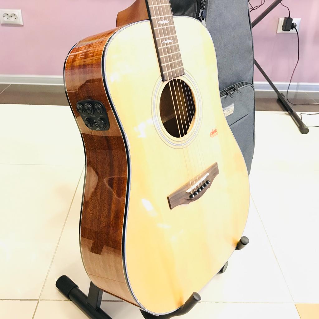 Трансакустическая гитара Kepma F1E D начинает линейку топовых инструментов. На ней стоит трансакустический блок — специальное устройство, которое позволяет играть с эффектами хоруса ревера и дилея без подключения к усилителю. Звук идет прямо из корпуса.