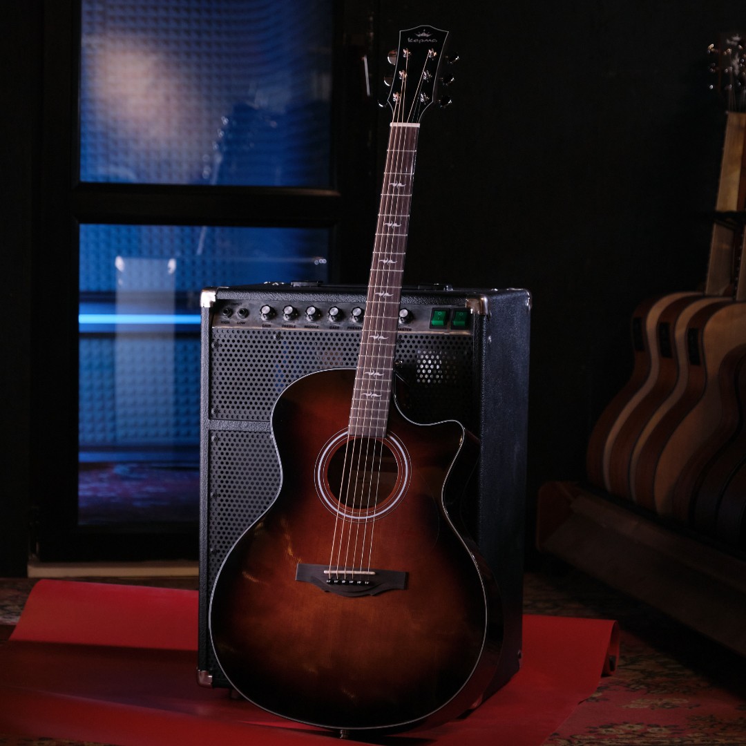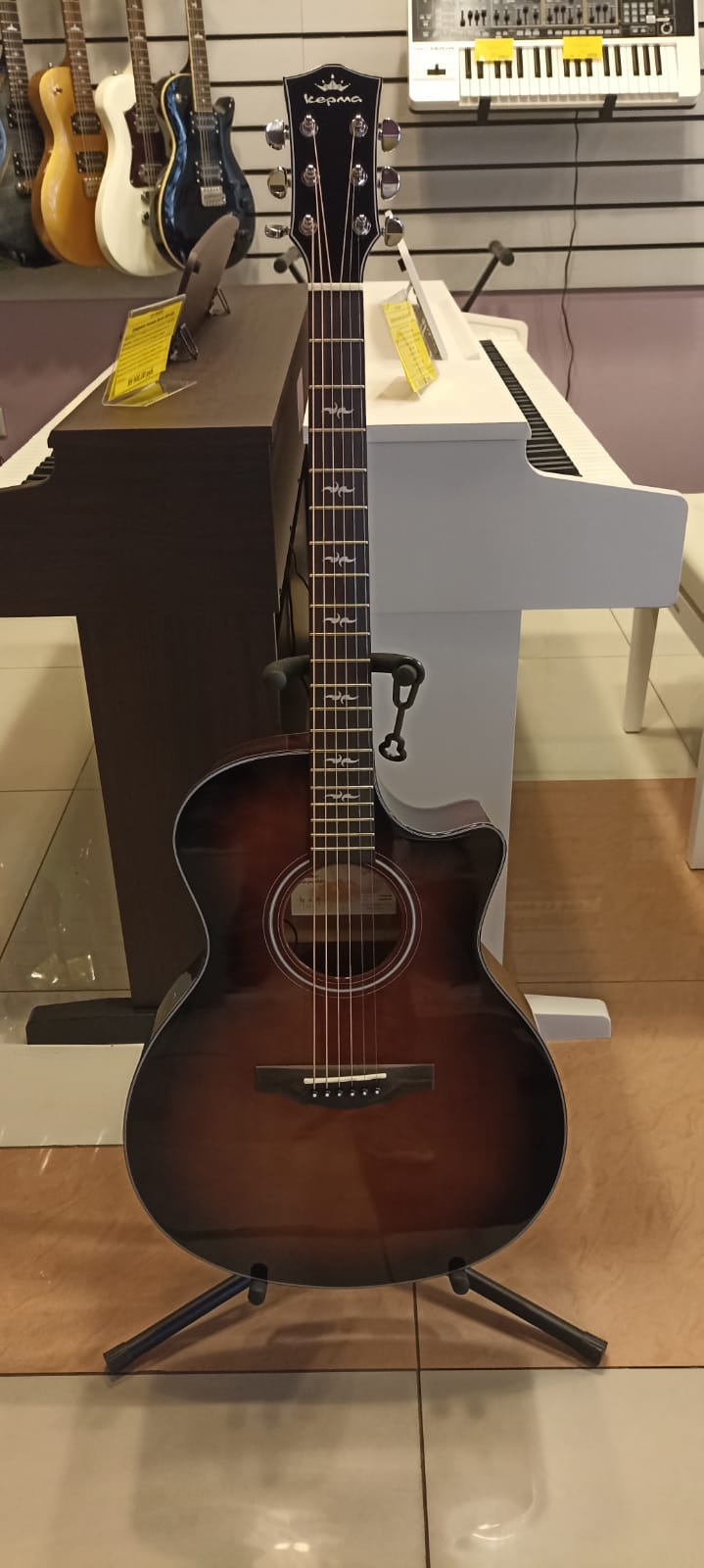 Трансакустическая гитара Kepma F1E GA начинает линейку топовых инструментов. На ней стоит трансакустический блок — специальное устройство, которое позволяет играть с эффектами хоруса ревера и дилея без подключения к усилителю. Звук идет прямо из корпуса.