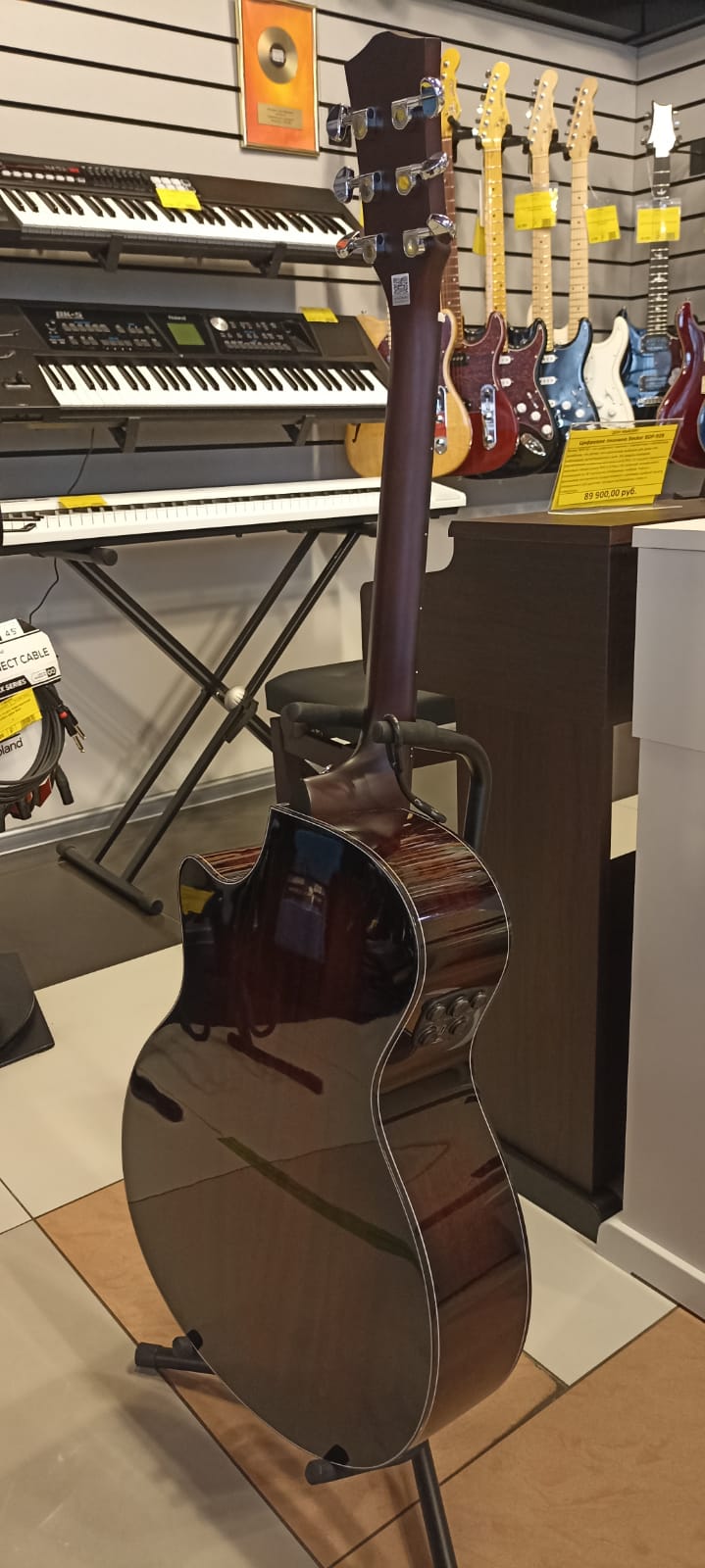 Форма корпуса — гранд аудиториум. По размером он где-то посередине между дредноутом и парлором. Благодаря этому, гитара очень универсальна в применении. Она обладает богатым на обертона звуком. Все благодаря материалам высокого качества. Верхняя дека – из массива ситхинской ели, нижняя дека и обечайки — красное дерево.
