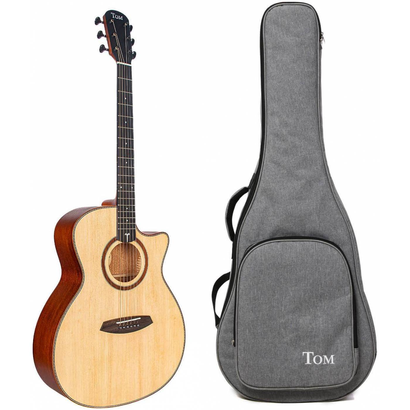 TOM GA-T1ME электроакустическая гитара в корпусе гранд аудиториум с вырезом. Верхняя дека из массива ели и корпус из красного дерева. В комплекте качественный чехол.