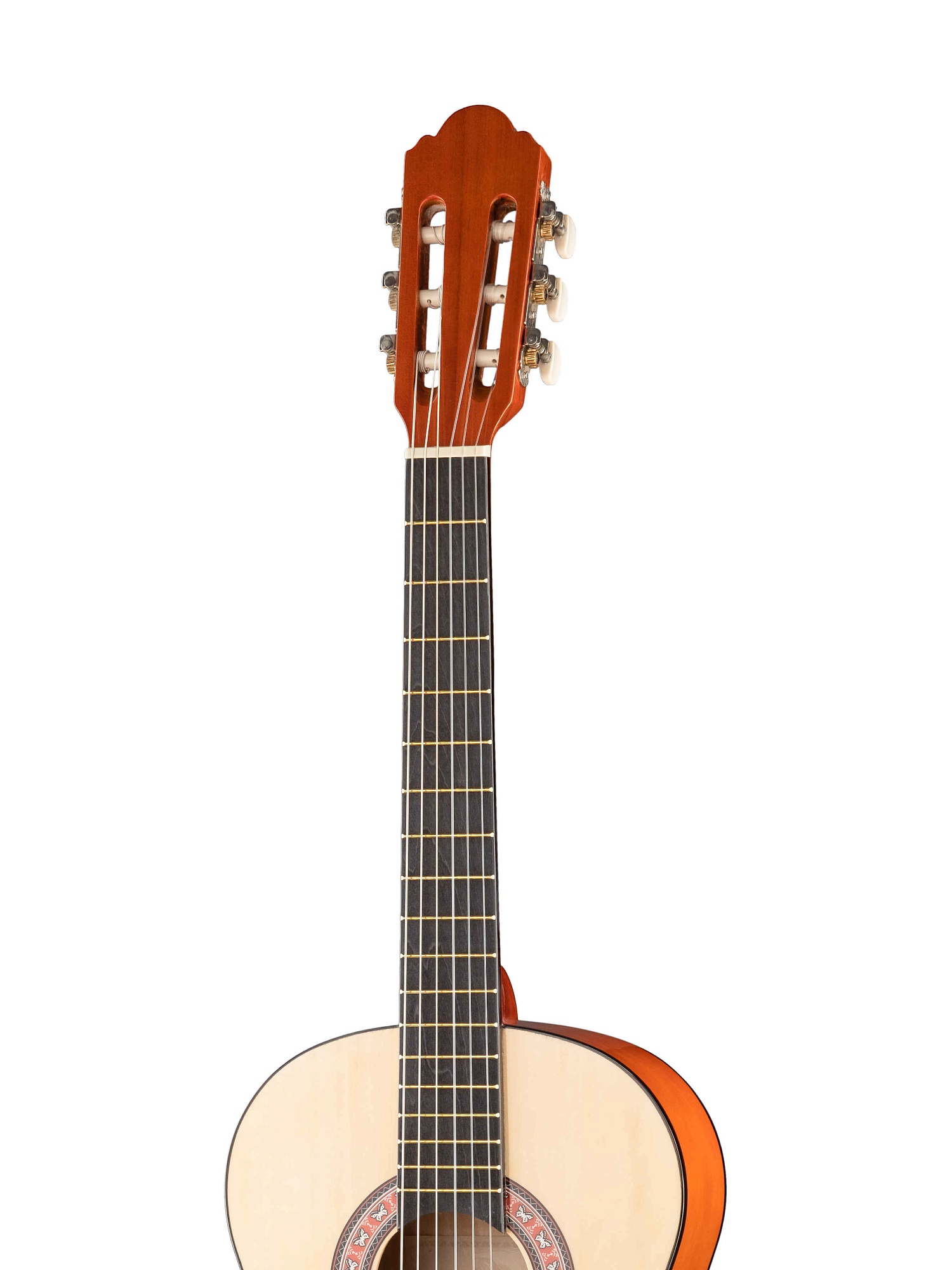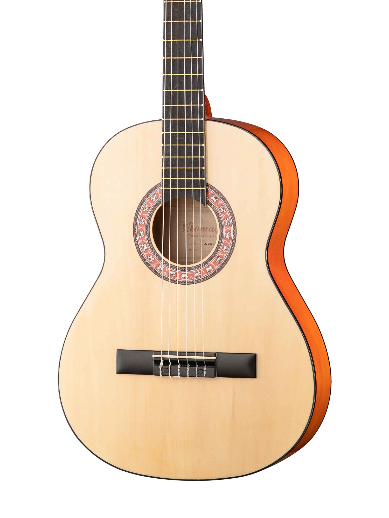LC-3600 Классическая 6-струнная гитара 3/4 36". Верхняя дека - ламинат ели, задняя дека и обечайки - липа, гриф- клен, накладка грифа - фанера, бридж - клен, колковая механика - хромированная, окантовка - 5-слойная, цвет - натуральный.Ширина грифа: 43мм HOMAGE