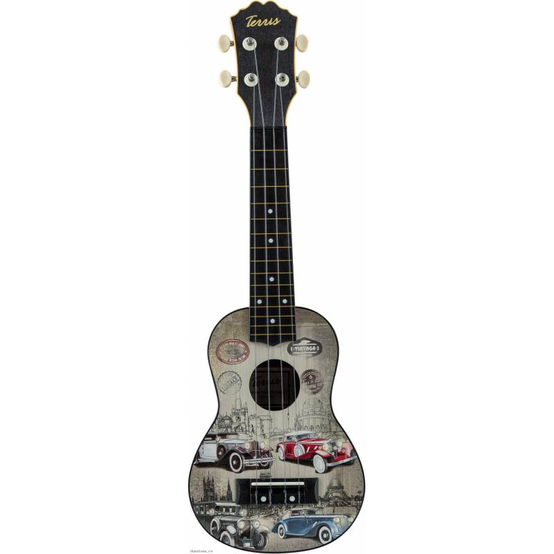 Укулеле TERRIS PLUS 70 CARS - модель с рисунком-подборкой красивейших автомобилей прошлого. Прекрасные ретрокары из разных уголков планеты - Италии, Франции, Англии. Эта модель укулеле элегантна и сдержана как и шикарные машины, изображенные на ней.
