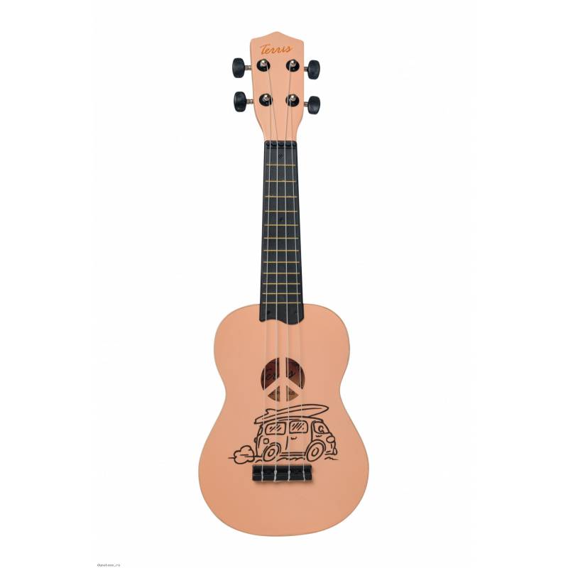 TERRIS PLUS BUS - укулеле песочного цвета, на верхней деке которой изображен автобус, а резонаторное отверстие выполнено в форме пацифика.