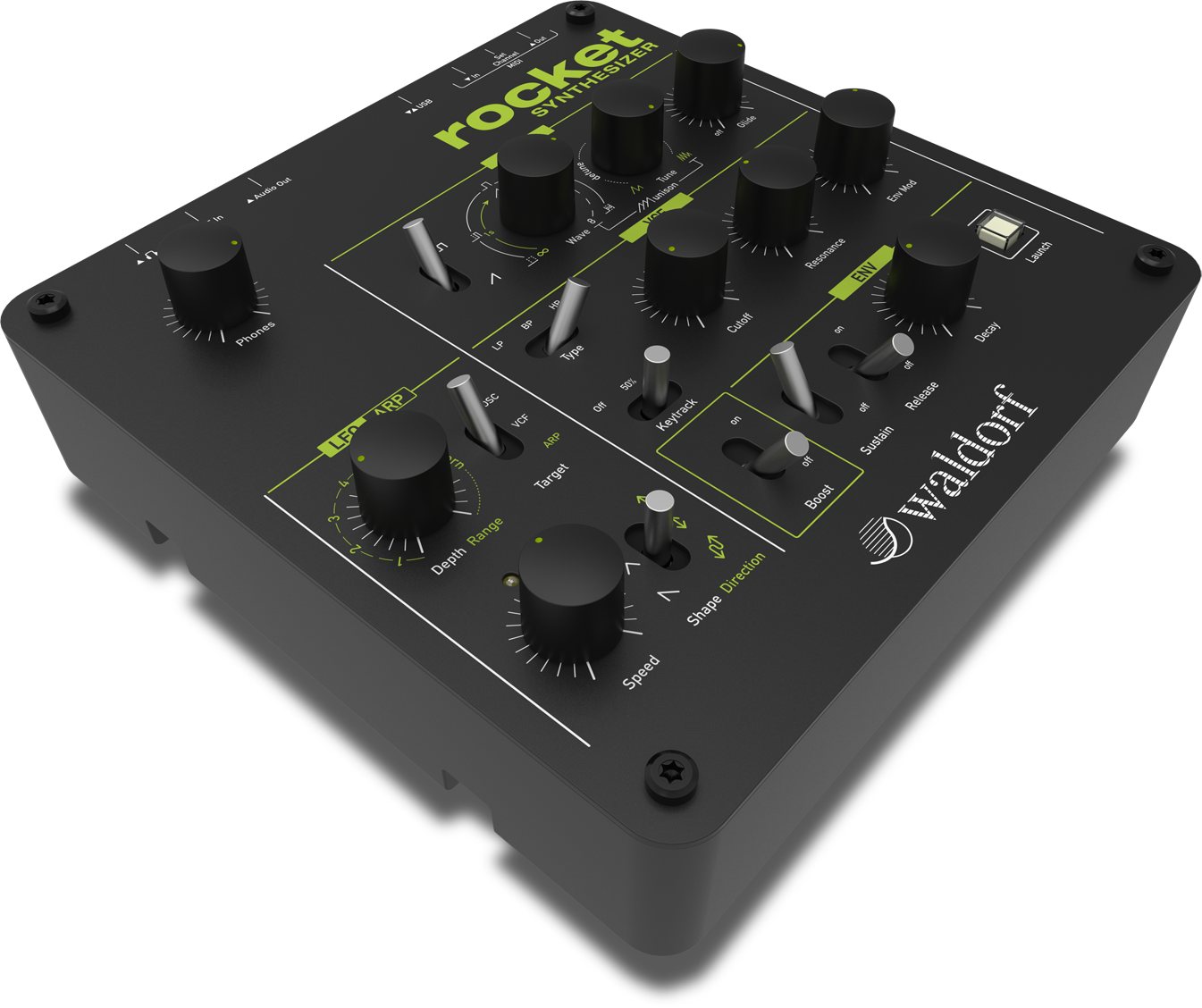 Тип: Аналоговый монофонический синтезатор, мультирежимный фильтр VCF (Low Pass/Band Pass/High Pass), VCF вход, до 8 осцилляторов в унисон, LFO, огибающие для VCA, VCF, Sync, цепи Booster для агрессивного звучания, Line Out, Headphone Out, MIDI In/Out, USB