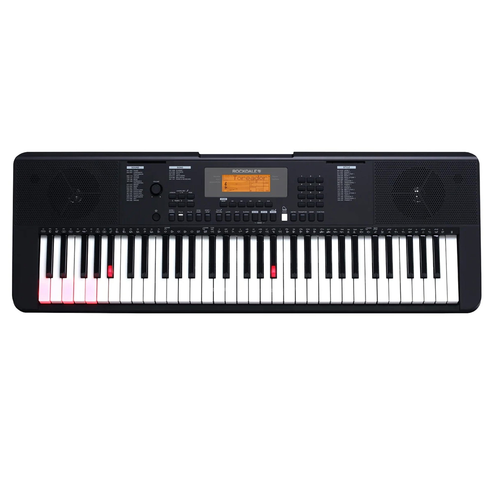 ROCKDALE Premiere 2 Lights синтезатор с автоаккомпанементом и подсветкой клавиш, динамическая клавиатура, 61 клавиша, 64 голосов полифонии, 585 тембров, 202 ритма, 157 демо мелодий, функция обучения, цифровой микшер, наложение тембров, 2х2,5Вт, 4кг