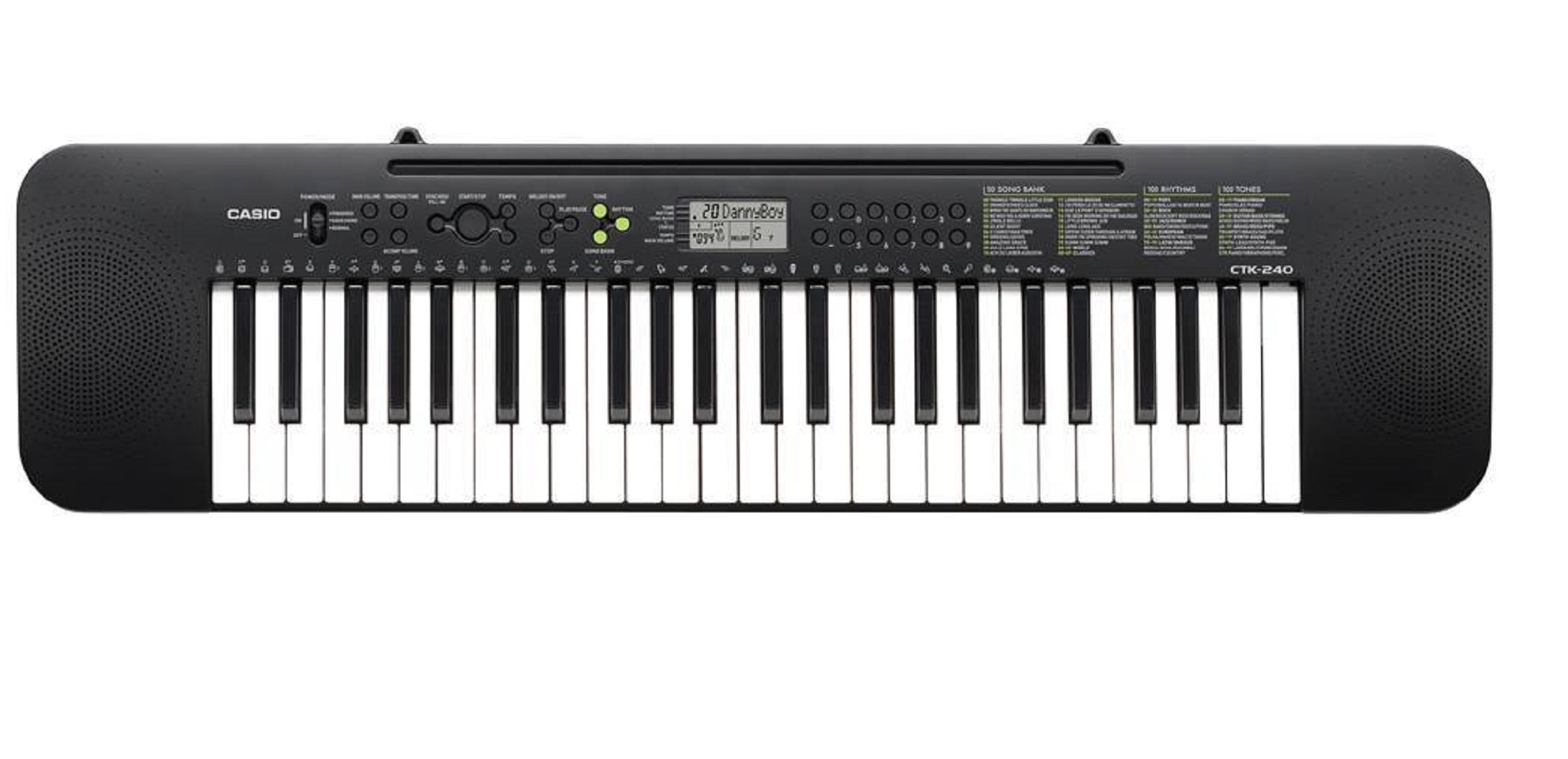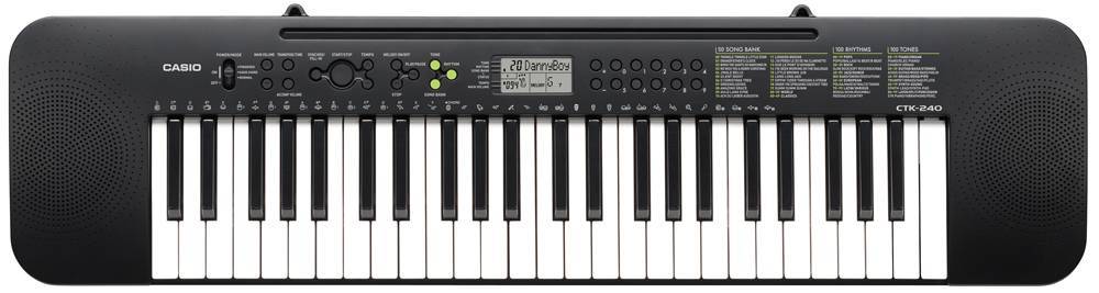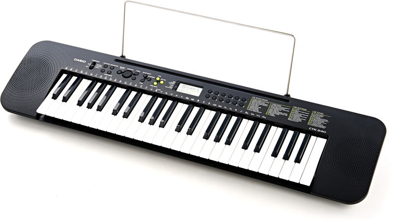 CTK-240 имеет 49 полноразмерных клавиш (4 октавы) и идеально сочетает развлекательные моменты с серьёзным обучением. 100 тембров, 100 ритмов и 50 обучающих мелодий - всегоэтого достаточно для того, чтобы неспешно освоить игру на инструменте. Ну а что касается дизайна, то даже он экстремально импрессивен: узкий, тонкий и чёрныйФункция вкл/откл мелодии - достаточно эффективна и позволяет отточить мастерство и отдельно потренироваться в партии правой руки.