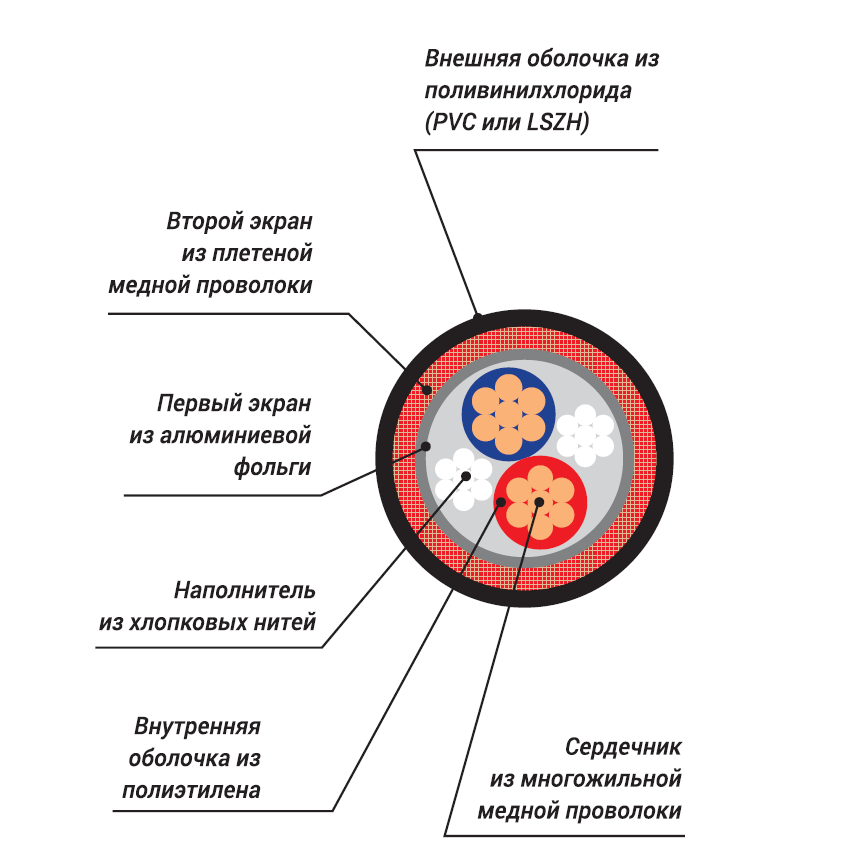 Внешняя оболочка выполнена из LSZH (Low Smoke Zero Halogen) представляетсобой малодымный безгалогенный компаунд. Такой провод не только медленногорит, но и не распространяет горение. А если на него воздействует открытый огонь,при пожаре например, то дым и черная сажа выделяться не будут.