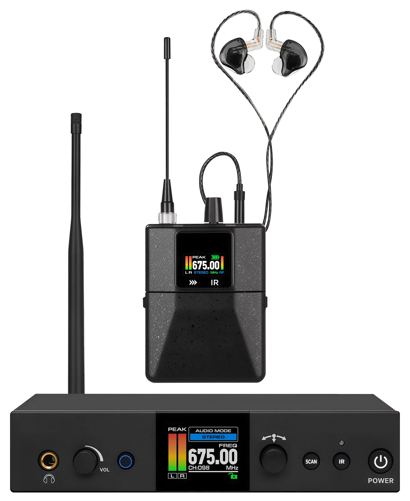 В состав системы входят поясной приемник DX800RX, передатчик и внутриканальные наушники.