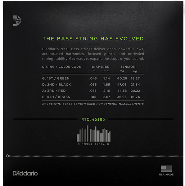 Струны для бас-гитар D'Addario's NYXL — это инновационное сочетание никелированной оплетки на основе из стали для расширенного динамического диапазона и гармонического отклика. NYXL45105 — гибридный комплект, оптимальный для музыкантов, ищущих как гибкости, так и глубокого, мощного звучания. Подходит для бас-гитар с мензурой 36 1/4 дюйма.