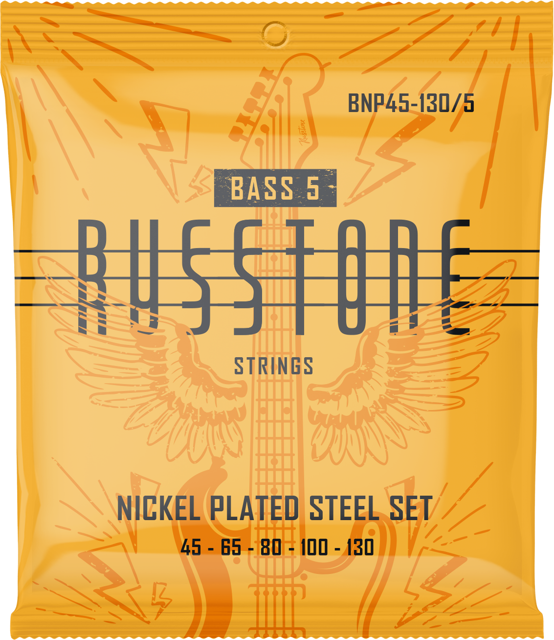 Russtone BNP45-130/5 – комплект струн BNP для 5-струнной бас-гитары. Комплект с дополнительной пятой струной, предназначенный для средне/легкого натяжения. Отлично подходит для агрессивной игры и позволяет извлекать чистый и звонкий тон.