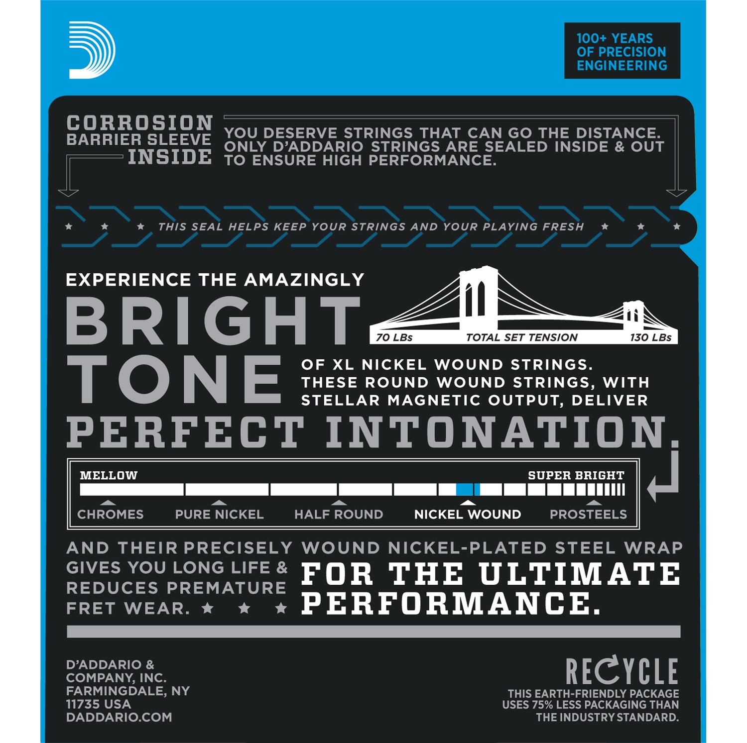 Струны XL с никелевой обмоткой - самые популярные струны D'Addario для электрогитары - выполняются в прецизионной обмотке из стали с никелевым покрытием, нанесенной на тщательно изготовленный сердечник шестигранного профиля из стали с высоким содержанием углерода. В результате получаются струны с долгим, отчетливо ярким звучанием и превосходной интонацией, идеально подходящие для самого широкого спектра гитар и музыкальных стилей.