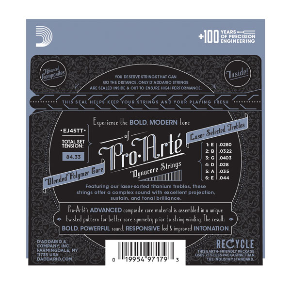 EJ45TT - комплект струн с натяжением Normal - включает басовые струны DynaCore серии Pro-Arte и верхние струны из титана, обеспечивающие безукоризненное сочетание звучания, яркости и проекции.