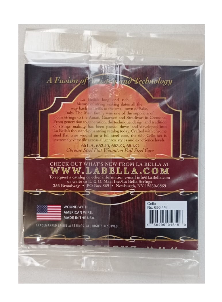 650 Комплект струн для виолончели. Струна ЛЯ - стальной керн, хромированная плоская оплетка, Струна РЕ - стальной керн, хромированная плоская оплетка, Струна СОЛЬ - стальной керн, хромированная плоская оплетка, Струна ДО - стальной керн, хромированная плоская оплетка. LaBella США
