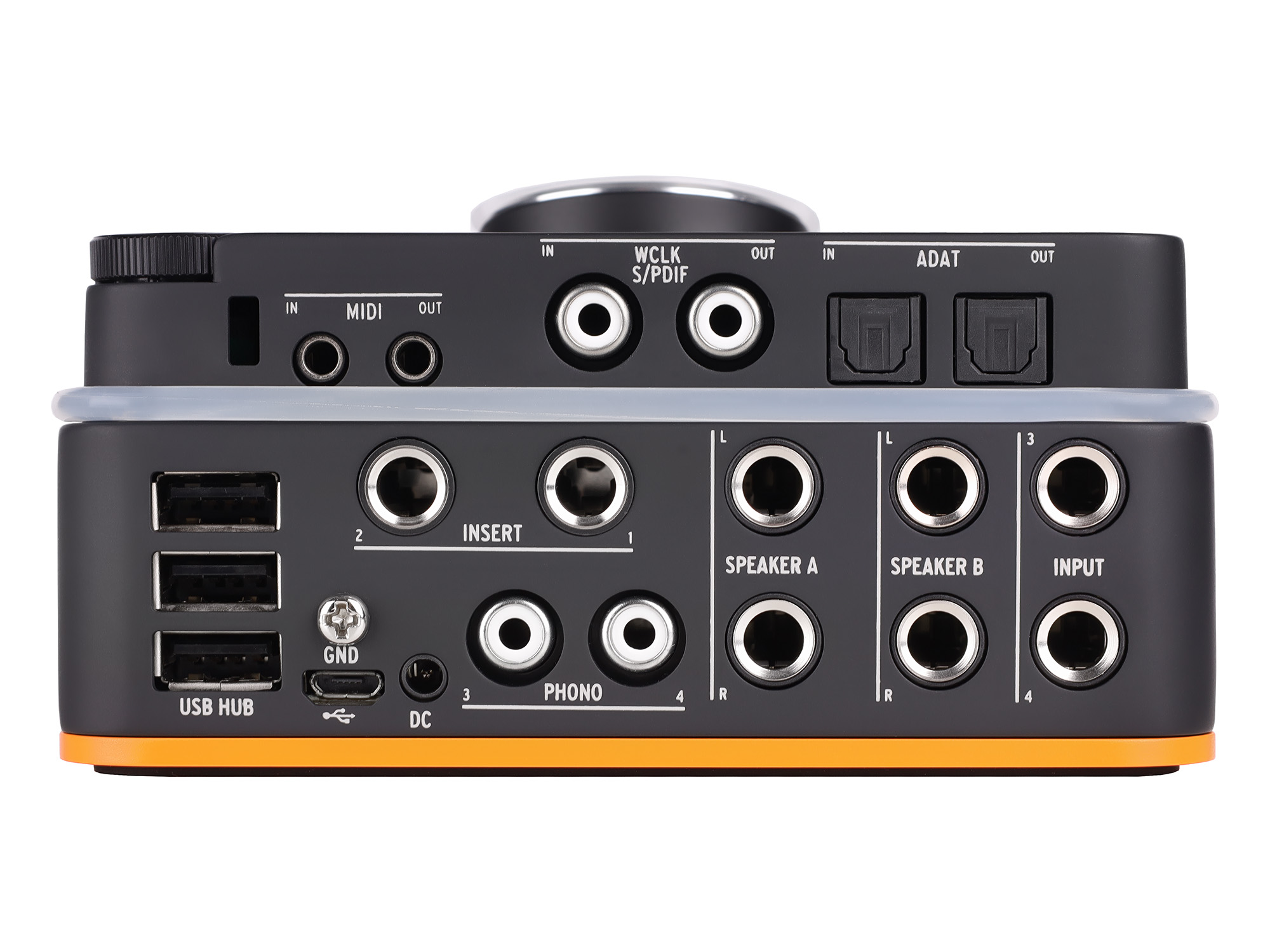 4 аналоговых входа: пара микрофонных/линейных/инструментальных на комбинированных разъёмах XLR/TRS плюс два входа Phono/Line;