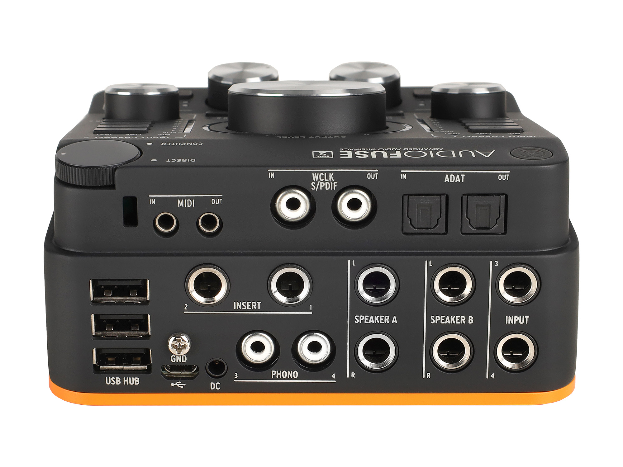 4 аналоговых TRS-выхода позволяют подключить две пары мониторов, между которыми можно переключаться;