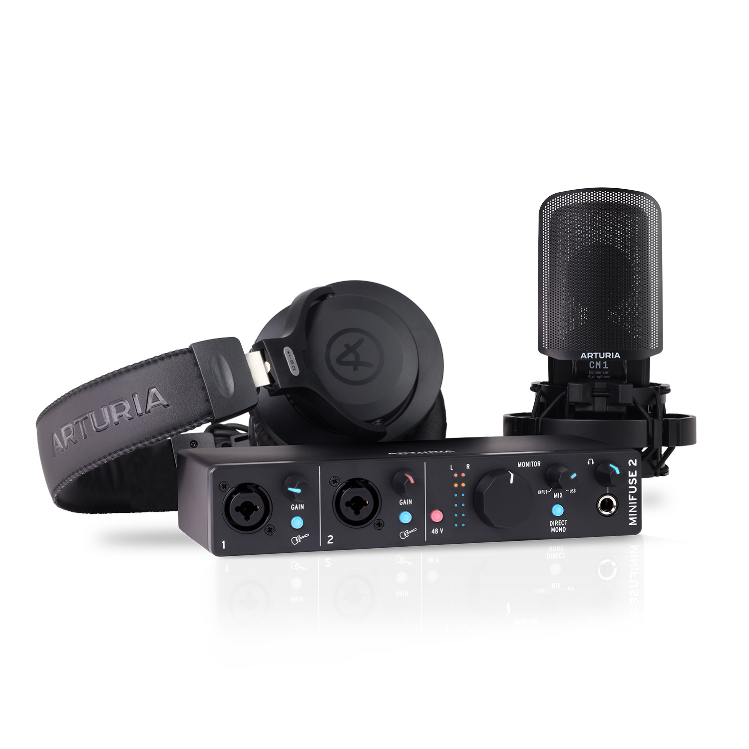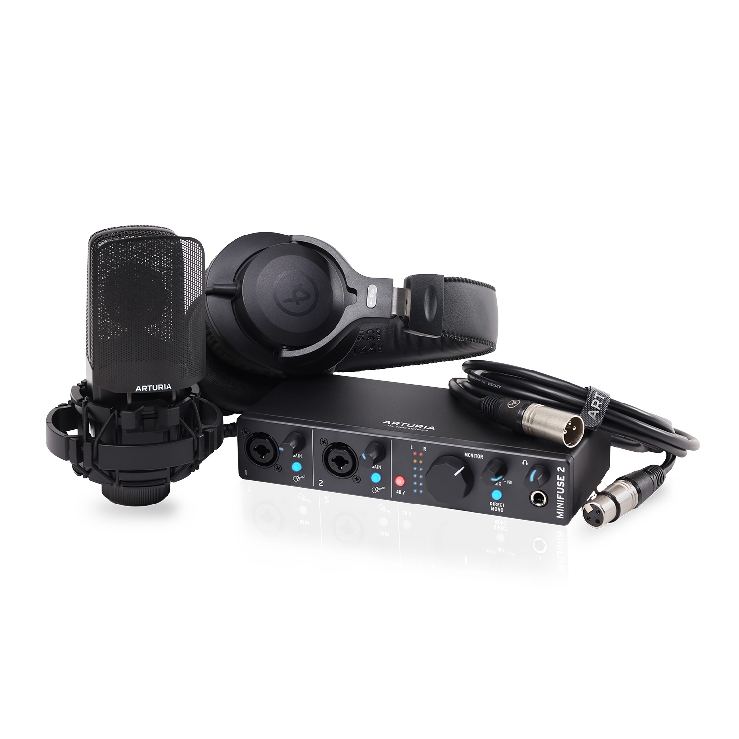 В комплект входит звуковая карта ARTURIA MINIFUSE 2, обладающая низким уровнем шума -129 дБ, низкими искажениями и высоким динамическим диапазоном 110 дБ. Карта оснащена двумя профессиональными предусилителями с комбинированными разъёмами XLR/TRS, дополнительным портом USB-A, одним разъёмом TRS на наушники, двумя выходами для мониторов, а также имеет разъёмы MIDI I/O и является портативным звуковым USB интерфейсом.