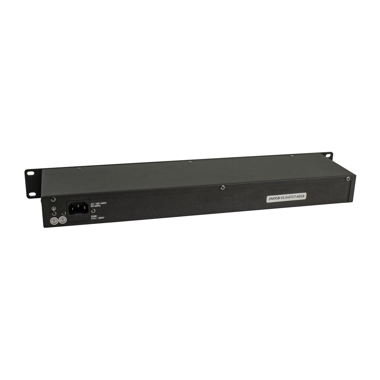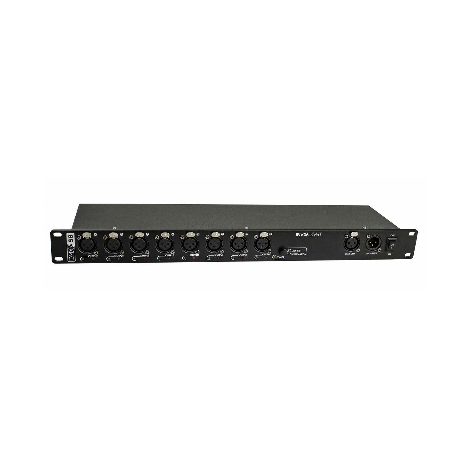 DMX-сплиттер "DMXS8" имеет один вход и восемь выходов. Для подключения на каждый канал предлагается трех-контактный XLR разъём, который служит в качестве DMX-выхода. Каждый DMX-выход имеет независимый трансформатор. С помощью переключателя LINK-выхода возможно завершить или продолжить DMX-сигнал на другие приборы.