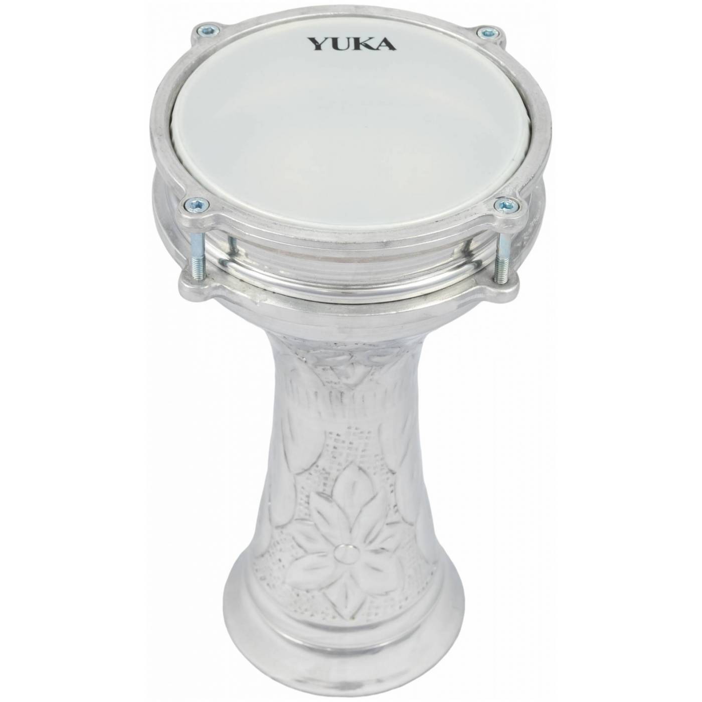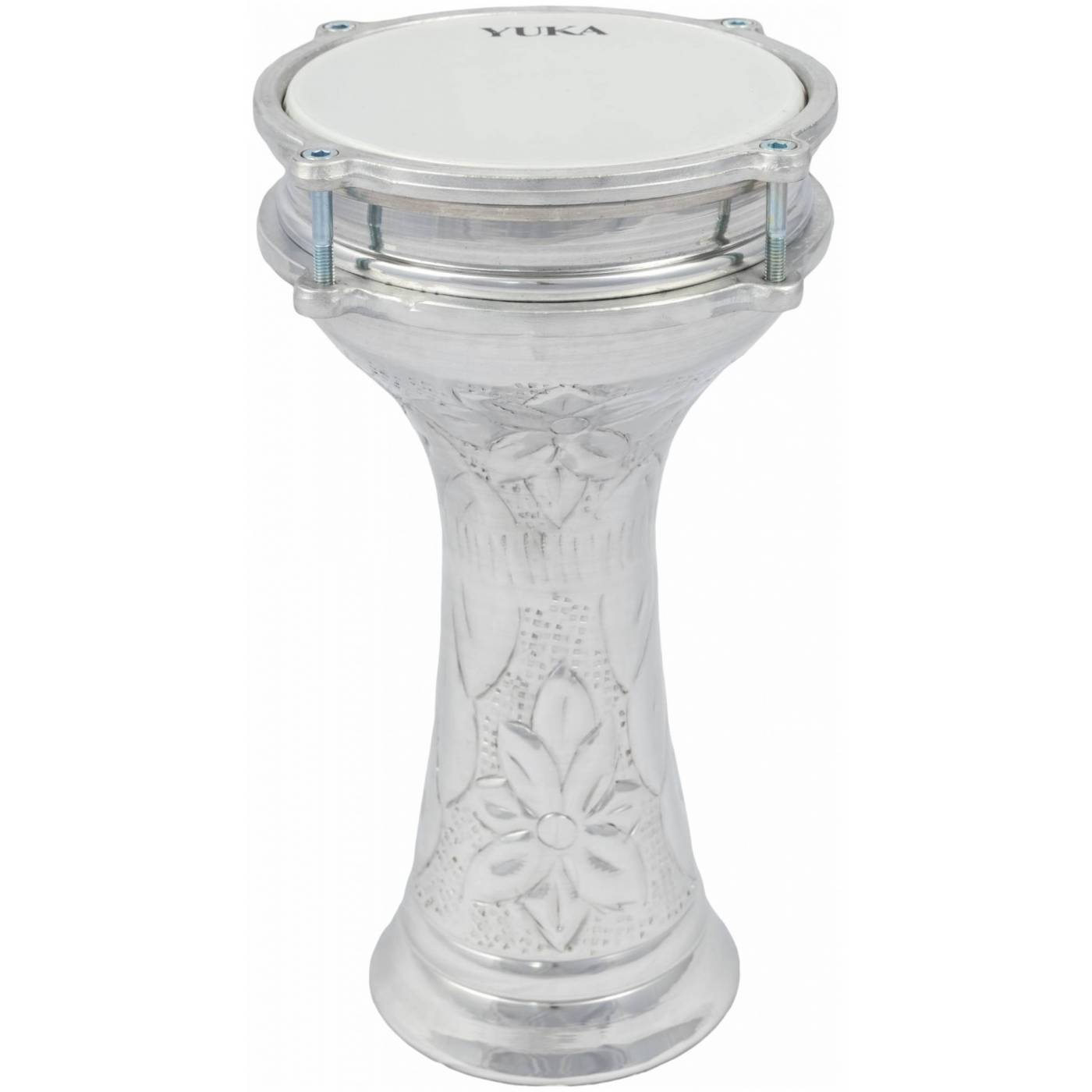YUKA DRBTG6-12 M Турецкая дарбука размера 6' x 12' сделана из алюминия и имеет мембрану из пластика, в связи с чем она имеет легкий вес и позволяет использовать барабан на улице, не боясь дождя и даже снега. Таким образом, эта дарбука – идеальный походный вариант обладающий полным пространным звуком и легкостью конструкции. А корпус с выкованым вручную арабским рисунком, придает инструменту особый вид.Технические характеристики: