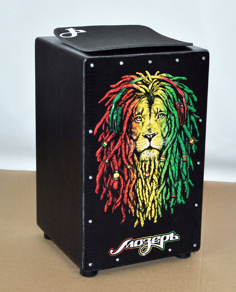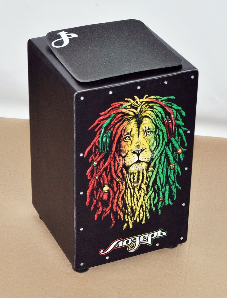 Кахон с глубоким басовым звучанием в сочетании с тонким звуком гитарных струн, резонаторная сторона из березы 3мм, регулируемая система натяжения струн, цвет корпуса черный, тапа с принтом афро-лев.