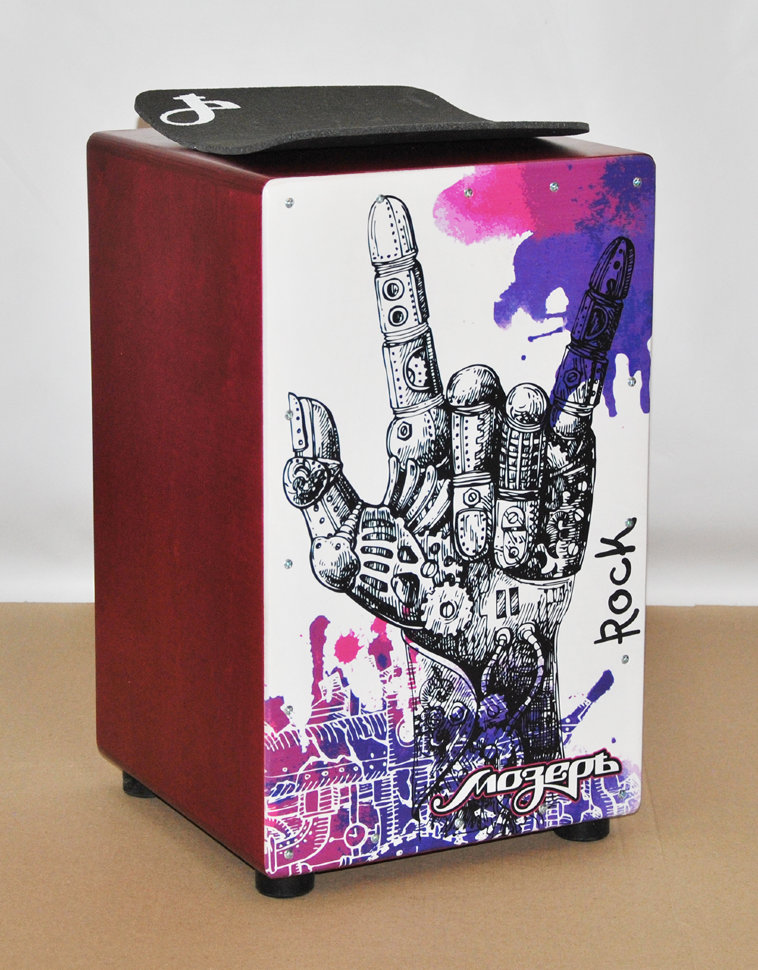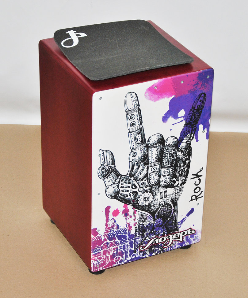 Кахон с глубоким басовым звучанием в сочетании с тонким звуком гитарных струн, резонаторная сторона из березы 3мм, регулируемая система натяжения струн, цвет корпуса бордо, тапа с принтом рок.