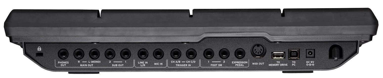 • Входные/выходные разъемы и порты: Наушники (6,3 мм TRS phone джек), аудиовыходы: MAIN OUT L (MONO), MAIN OUT R, SUB OUT 1, SUB OUT 2 (6,3 мм TRS phone джек), аудиовходы: LINE IN L/R, MIC IN (6,3 мм TRS phone джек), триггерный вход: CH A/B, C/D (6,3 мм стерео phone джеки), ножные педали 1, 2 (6,3 мм TRS phone джеки), педаль экспрессии (6,3 мм TRS phone джек), MIDI выход, USB-A (Type-A) Стандартная версия USB. 2.0, совместимость с Hi-Speed (480 Мбит/с), USB-B (Type-B) Стандартная версия USB. 2.0, совместимость с Hi-Speed (480 Мбит/с)