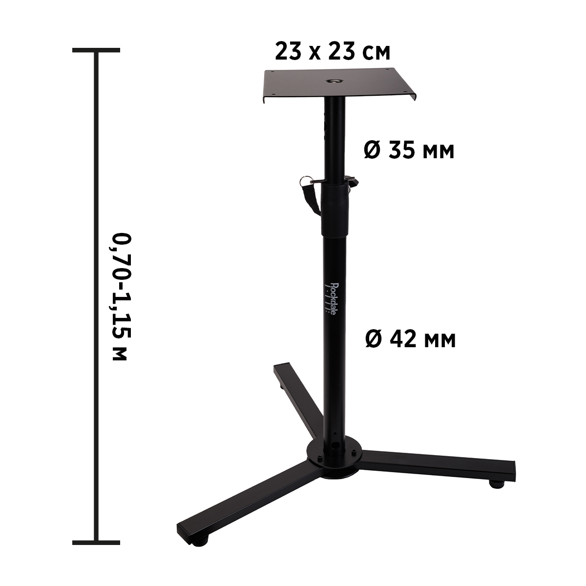 Высоту можно настроить в диапазоне от 70 до 115 см. Акустика размещается на горизонтальной панели площадью 23 см х 23 см сверху стойки. Предусмотрено четыре отверстия для закрепления монитора. Кронштейн выполнен из прочной стали, окрашен в черный цвет.