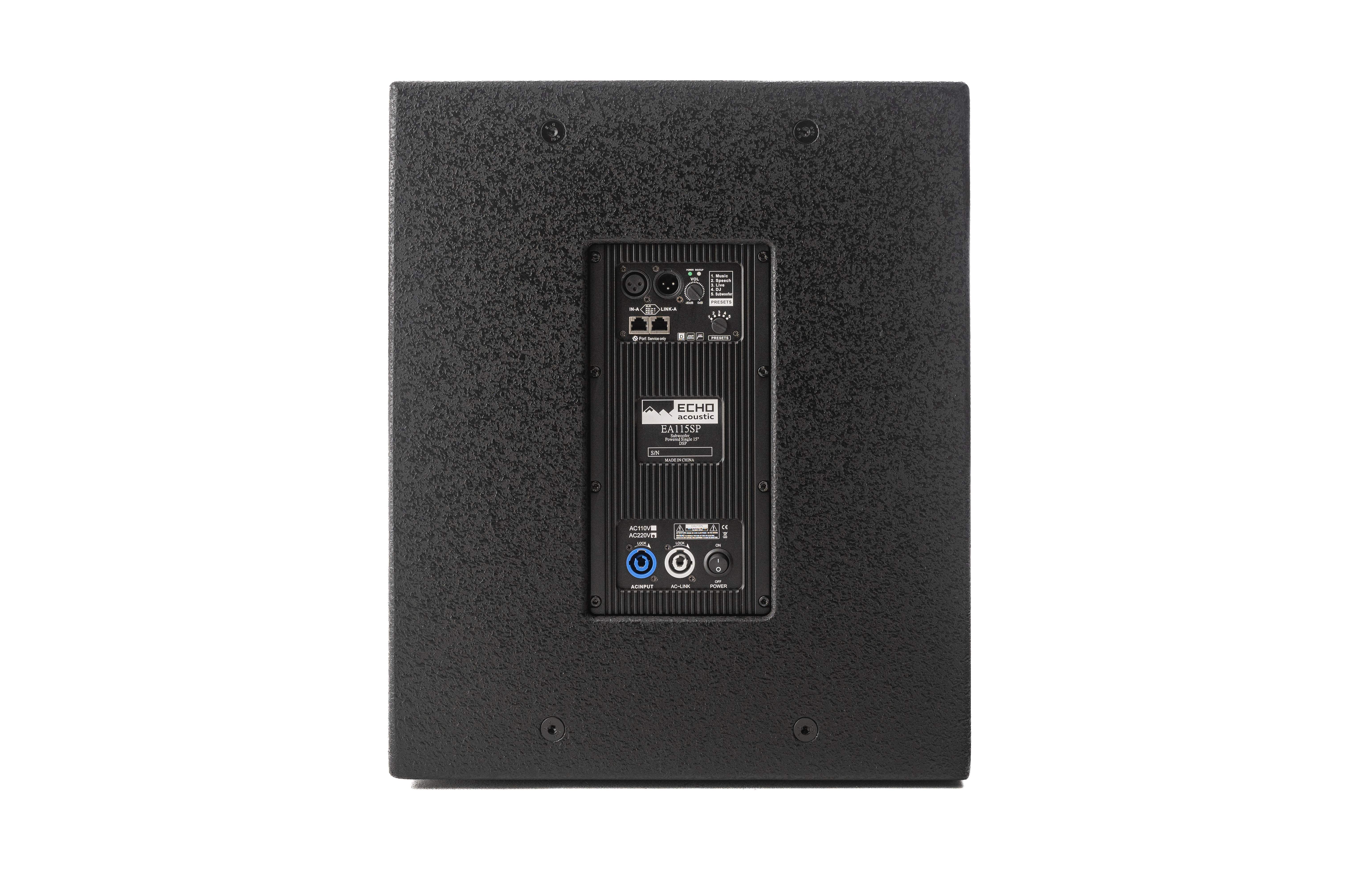 EA115SP – это компактный сабвуфер, предназначенный для усиления низкочастотных характеристик полнодиапазонных систем ECHO ACOUSTIC EA112P и EA115P.