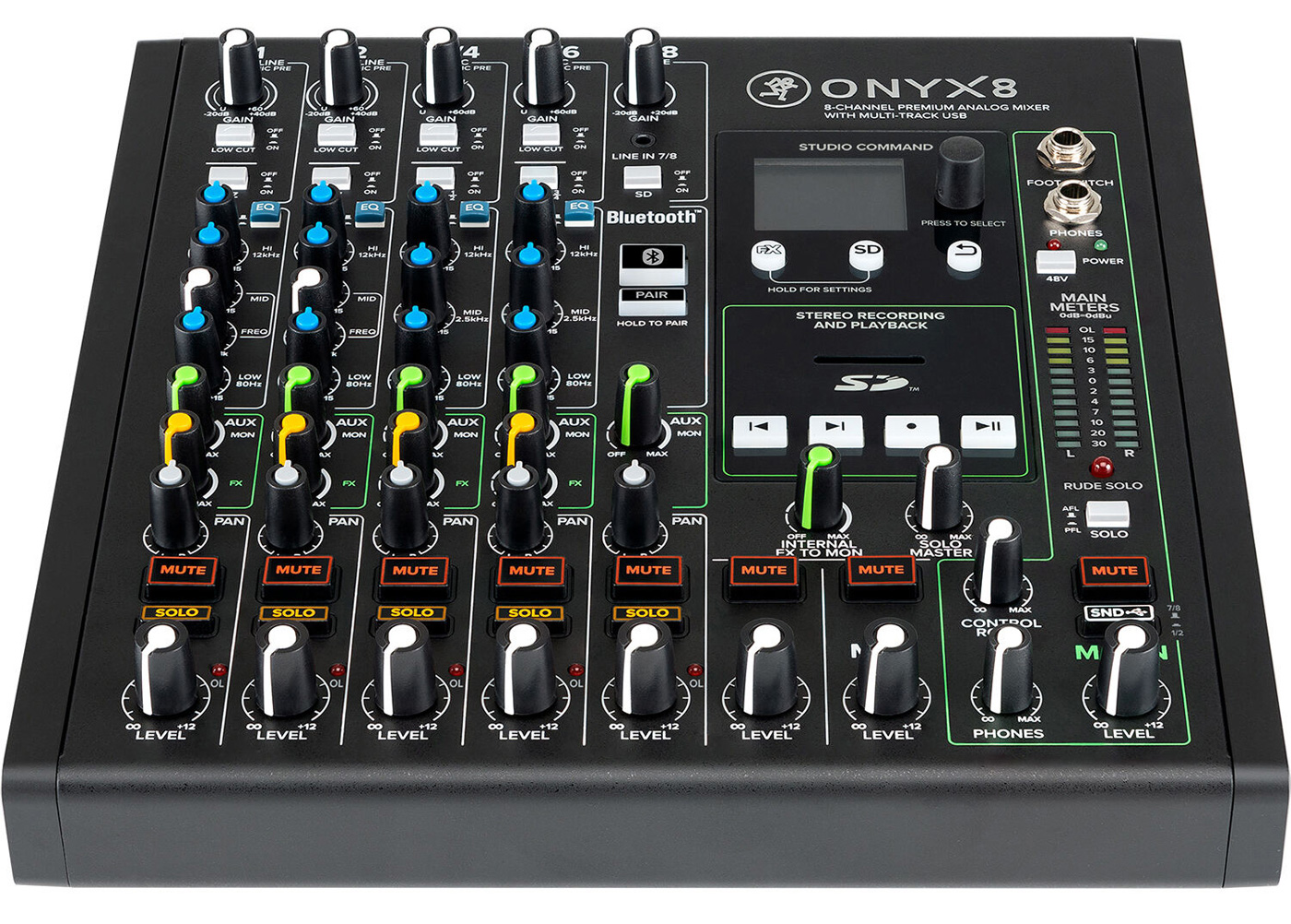 8-канальный премиальный аналоговый микшер / 4 микрофонных предусилителя Onyx / полноценная мультитрековая запись через USB с качеством до 24-бит / 96 кГц / Bluetooth / эквалайзер в «Британском стиле» / полноцветный дисплей Studio Command / встроенные профессиональные эффекты