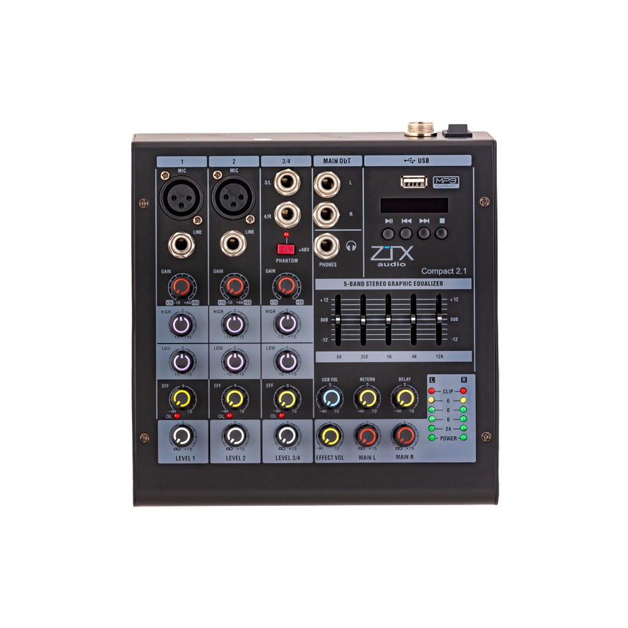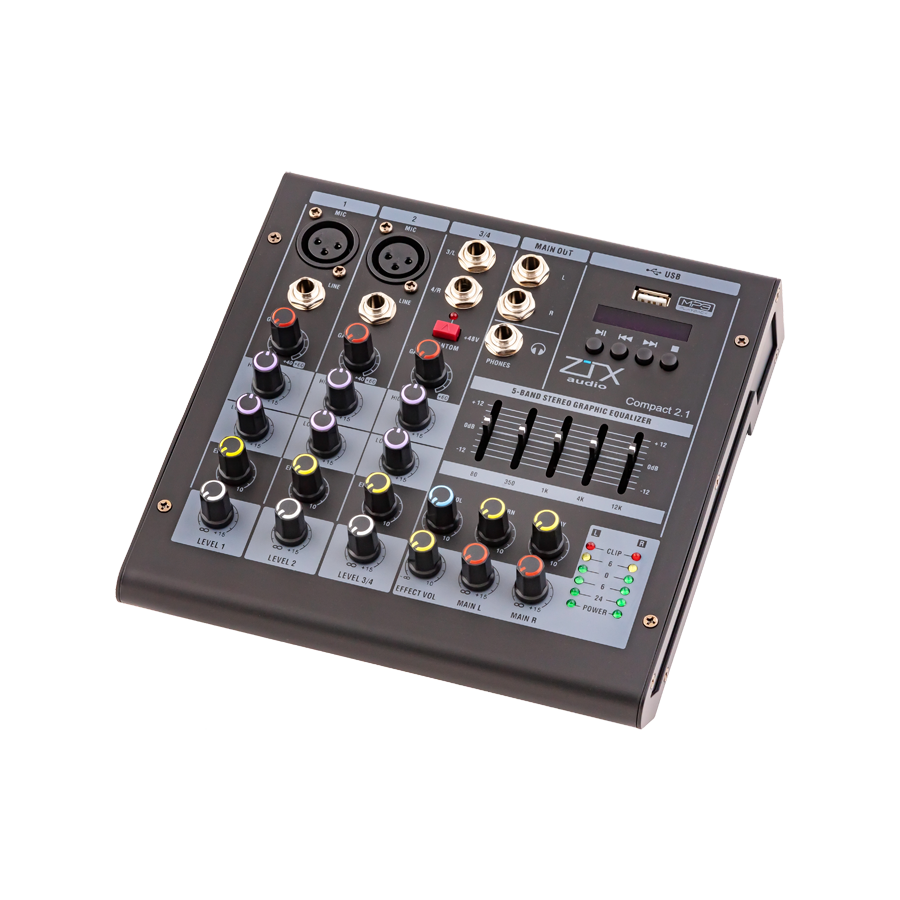 Оснащен всеми необходимыми функциями, дополненные рафическим эквалайзером, а также имеющие фантомное питание и дополнительные функции MP3 и Bluetooth (модель Compact 2.1 имеет только МР3), микшерные пульты ZTX Audio серии Compact станут незаменимыми помощниками в достижении качественного звука в небольших заведениях, школах и др.