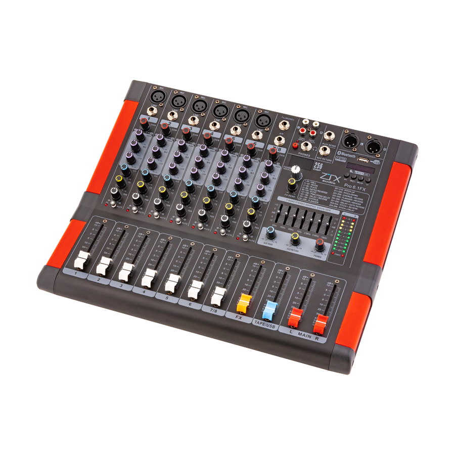 Профессиональная серия микшерных пультов ZTX Audio серии PRO выполнена на фейдерах. 256-канальный DSP-процессор и 7-полосный графический эквалайзер позволяют смикшировать и добиться качественного звучания от звукового оборудования любого уровня. В помощь при работе со звуком добавлены MP3, SD, USB-интерфейс для подключения к компьютеру и Bluetooth.