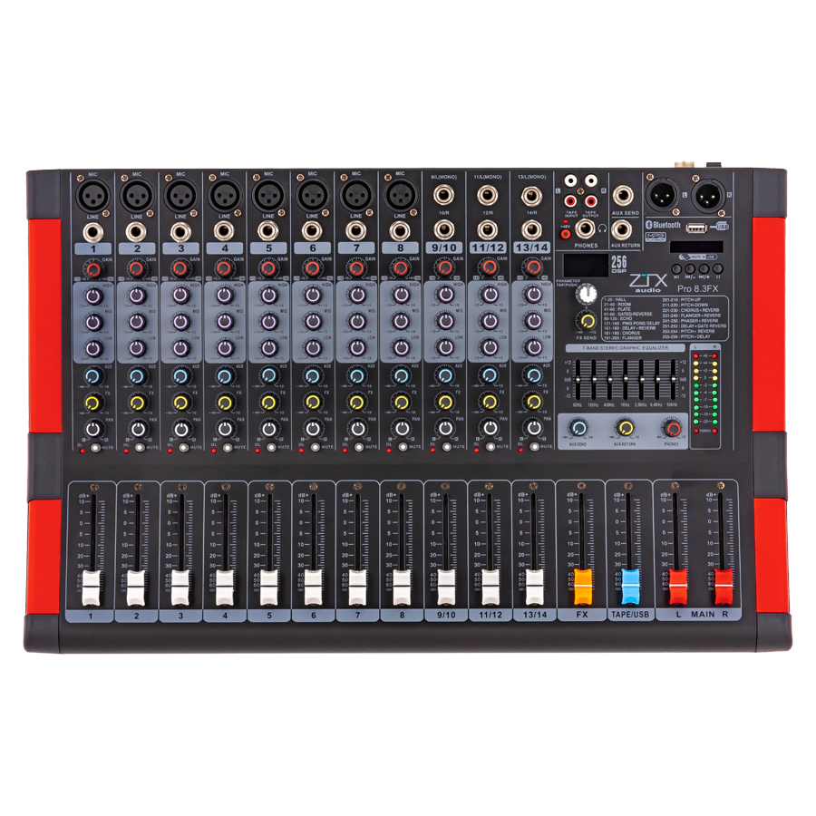 Профессиональная серия микшерных пультов ZTX Audio серии PRO выполнена на фейдерах. 256-канальный DSP-процессор и 7-полосный графический эквалайзер позволяют смикшировать и добиться качественного звучания от звукового оборудования любого уровня. В помощь при работе со звуком добавлены MP3, SD, USB-интерфейс для подключения к компьютеру и Bluetooth.