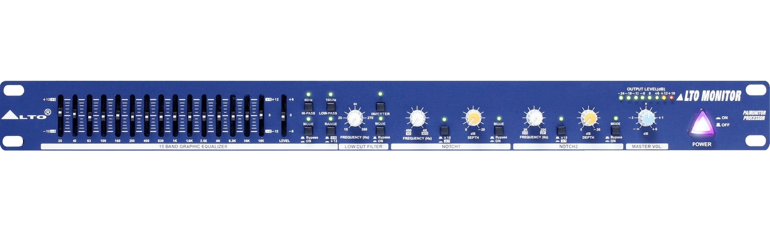 Комбинация из 15-ти полосного 2/3 окт. графического эквалайзера и 2-х нотч фильтров. Прибор предназначен для работы со сценическими мониторами. Каждый нотч фильтр имеет регуляторы глубины вырезания (0~ -20 дБ), частоты, кнопки множителя частоты и обхода фильтра. Кроме этого, есть регуляторы обрезного фильтра низких (15-360 Гц) частот, выходного уровня, 8-ми сегментный индикатор уровня, кнопки обхода графического эквалайзера, включения обрезных фильтров высоких (16 кГц), низких (40 Гц) частот и инвертирования фазы сигнала. Все кнопки имеют светодиодную индикацию. Входы и выходы - симметричные XLR и TSR 1/4 Джеки. Динамический диапазон >92 дБ (не взвешенный, 22 Гц-22 кГц). Полный коэффициент гармоник < 0,01% (1 кГц, +4 дБ). Диапазон частот 10Гц - 30кГц. Питание осуществляется от сети. Вес 2,8 кг. Размер – одна рэковая единица