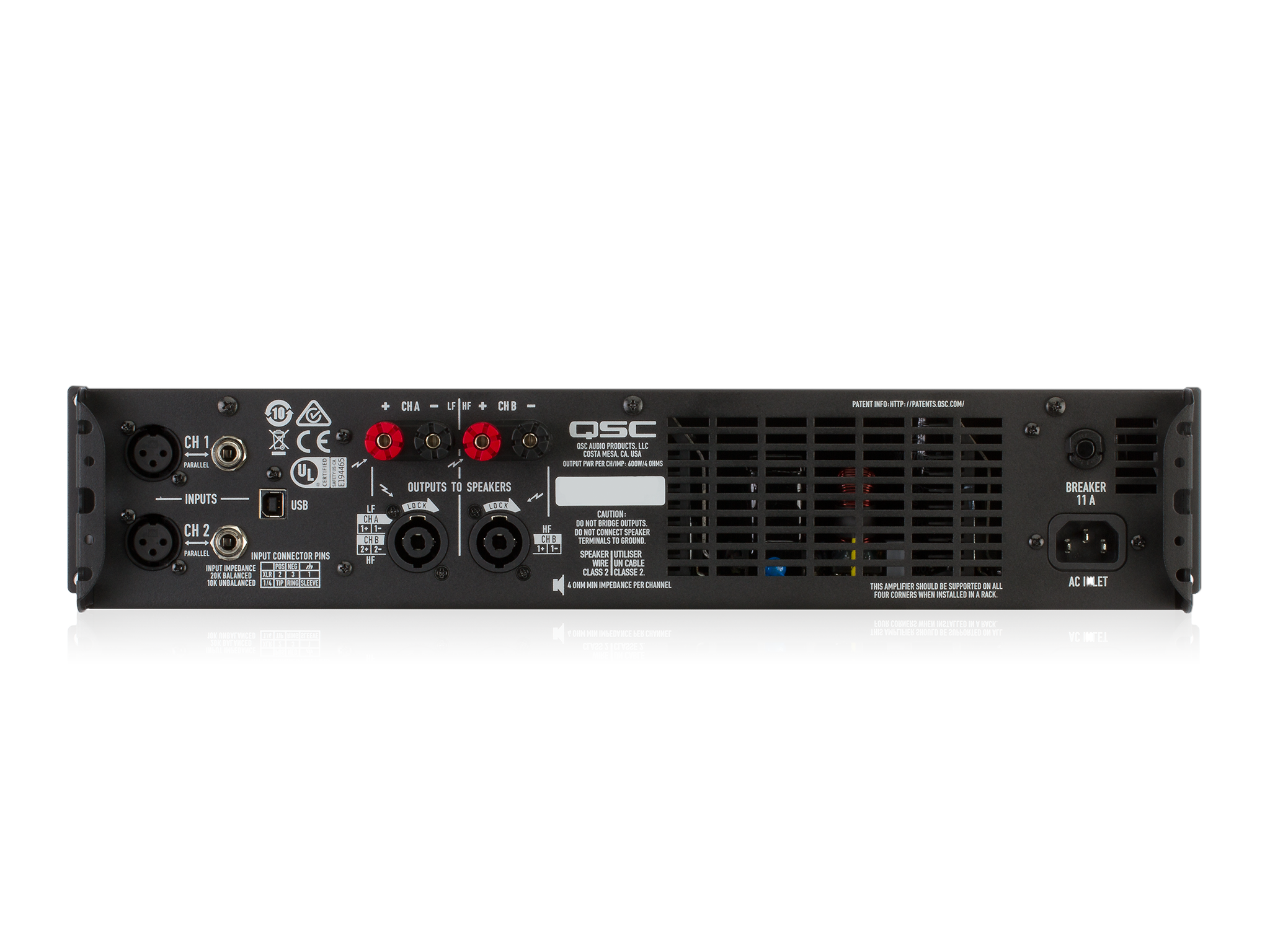 Балансные входы XLR-M и 1/4" TRS Jack, выходы на винтовых клеммах и Neutrik Speakon
